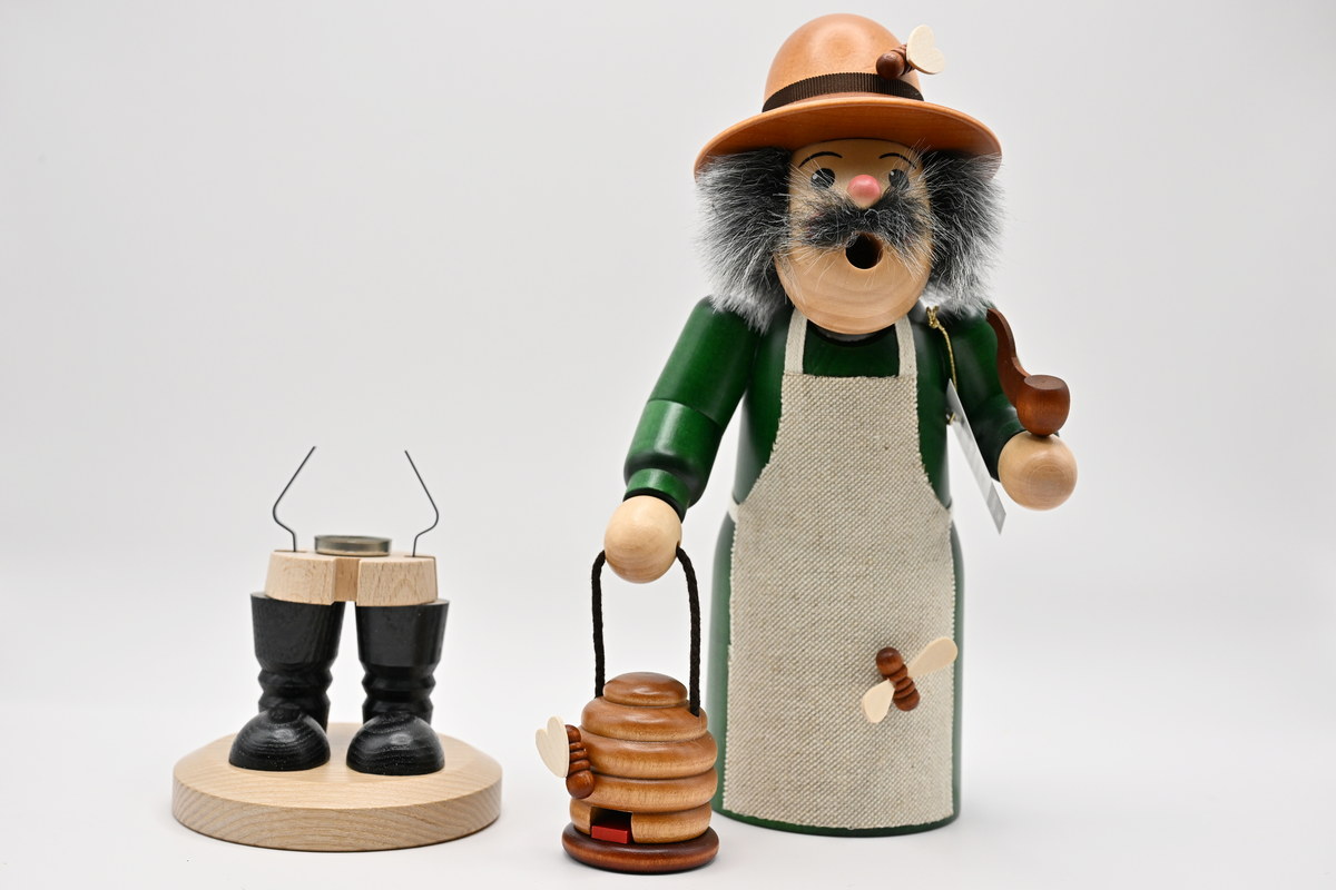Size: approx. 16 cm (H) Smoking his pipe, the herb merchant sets off for the weekly market. There he can sell his home-grown herbs at a profit. The body has been stained brown and red. The hat and scarf are made of green felt. Genuine handicraft from RATAGS – Made in Germany – 100% original Erzgebirge Never leave lit incense cones unattended.