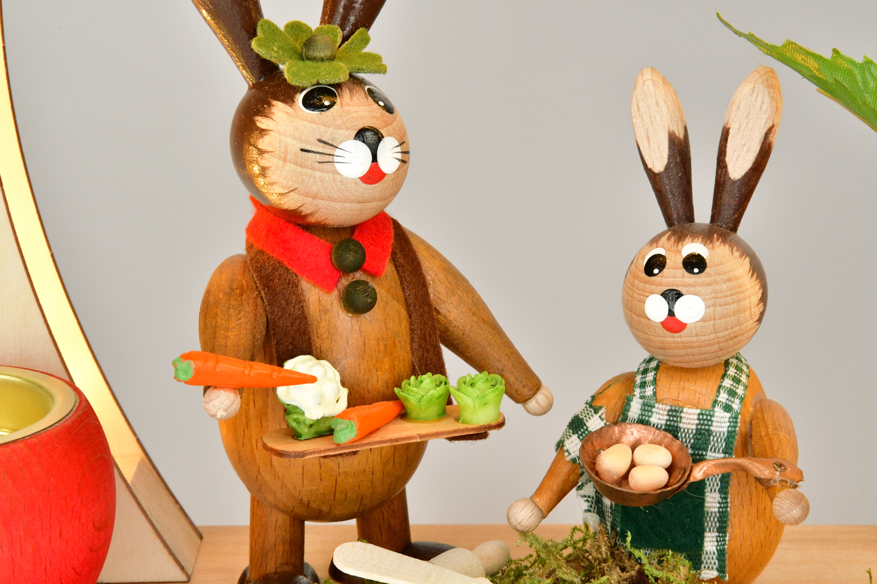 This spring-like romantic lamp with a pair of rabbits and climbing plants and indirect LED lighting will enchant your rooms with its atmospheric glow. It offers a dual function thanks to the additional tea light holder (also suitable for small pillar candles). The two bunnies are busy enjoying a rabbit meal. Easter eggs and floral decorations complete the Easter scene.