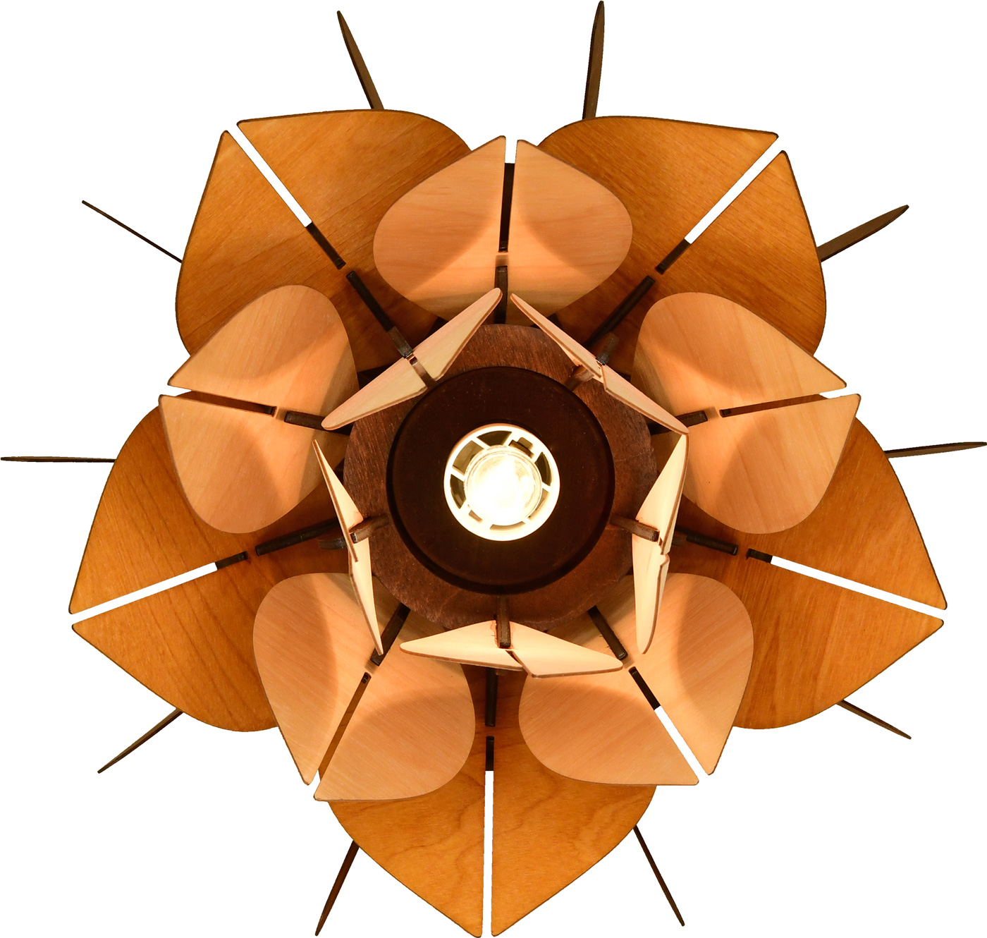 This artistic decorative piece in the shape of a lotus flower made of fine birch plywood attracts attention and conjures up a touch of romance in the home. Like an illuminated flower calyx, the blossom opens upwards and releases the light onto the ceiling without glare.