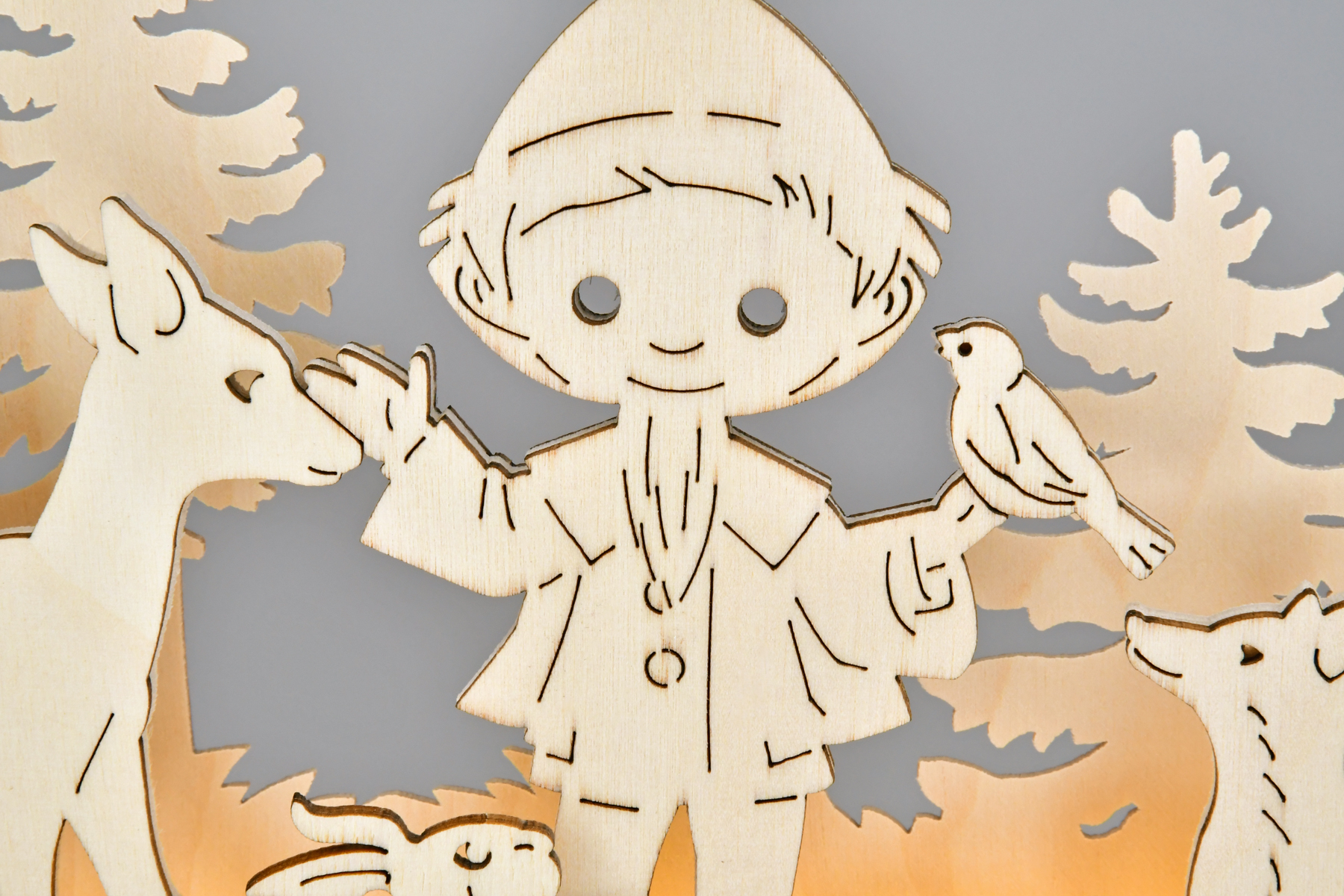 Our Sandman says good night to the animals of the forest. Deer, owls, squirrels, foxes, hares, hedgehogs and birds gather peacefully under the starry sky. The sight of this scene has a calming effect and can help your children fall asleep. The indirectly installed LED lighting provides glare-free light and creates a cosy atmosphere.