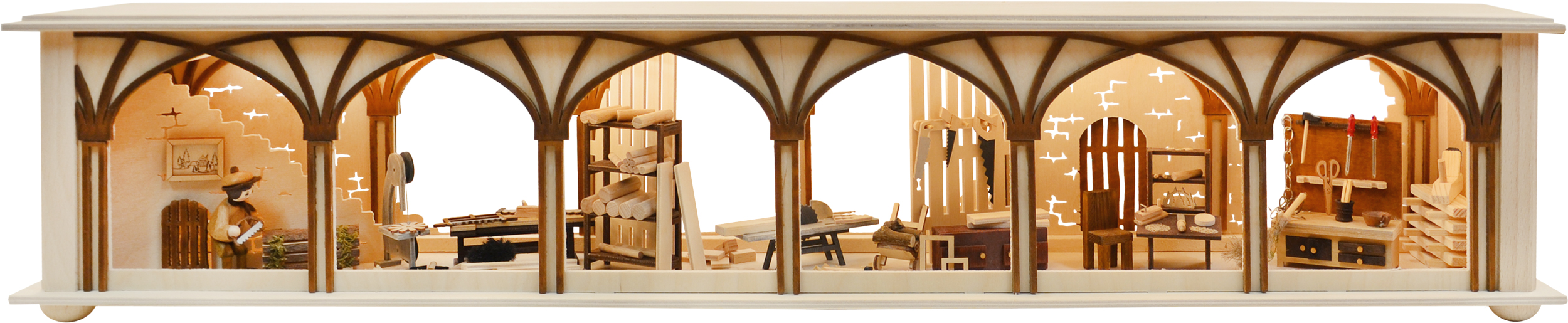 The large room light with its detailed design is a very special base for your Schwibbogen. The motif is a well-organised craft cellar in a vaulted room. With its depiction of typical furnishings such as a circular saw or band saw, various shelves, a workbench or planing bench, a wood store and workstations, this room light made of light birch plywood is a special eye-catcher in your home. Our fretwork radiates a special cosiness thanks to the indirect LED lighting.