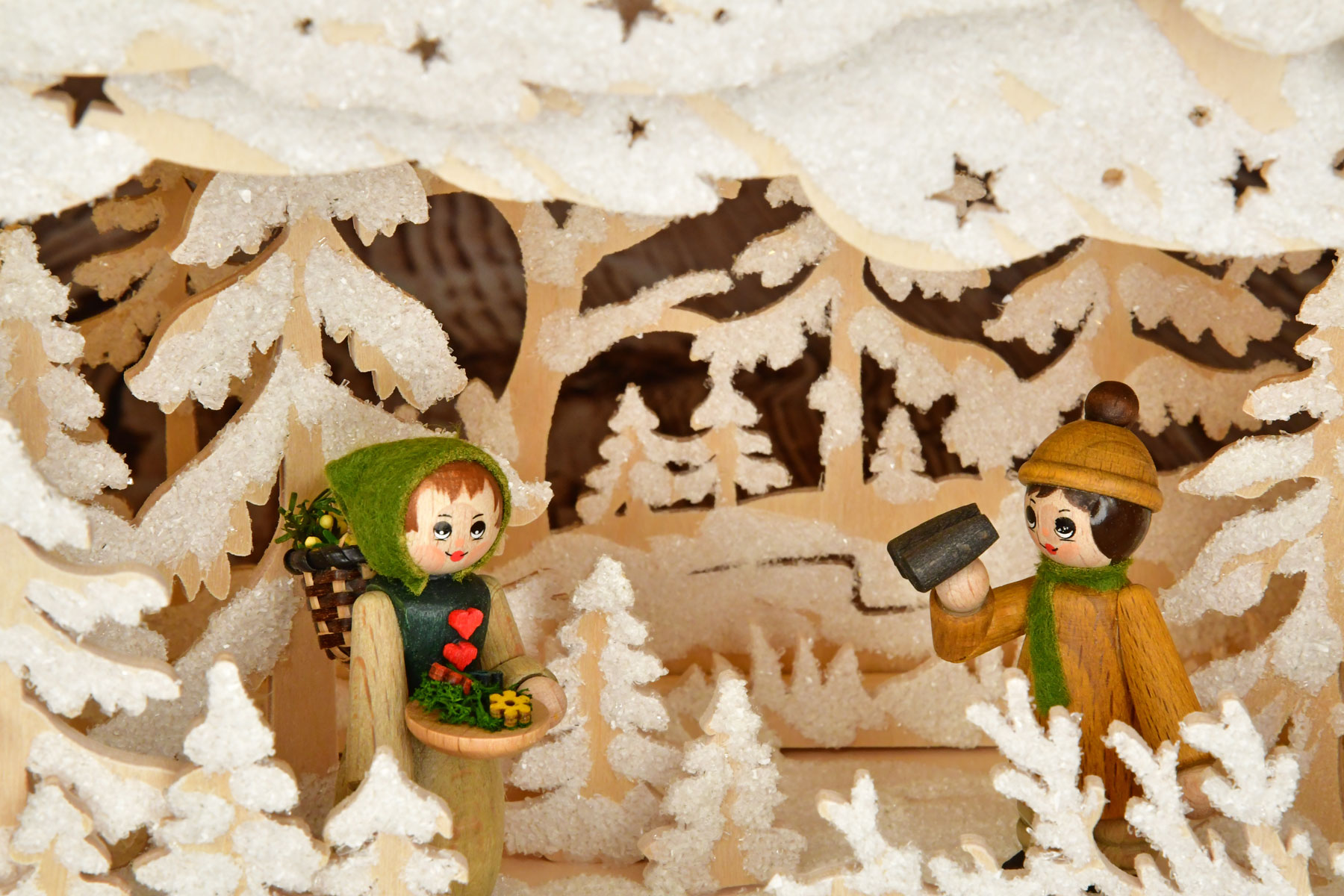 Size: 80 x 15 x 12 cm (WxHxD) Lighting: LED, 20 pieces Large room light, forest, 2 winter children, snowman. All figures are made of solid wood and hand-glazed in colour. The glare-free LED lighting bathes the scene in an atmospheric light. Genuine handcrafted by RATAGS – Made in Germany – 100% original Erzgebirge