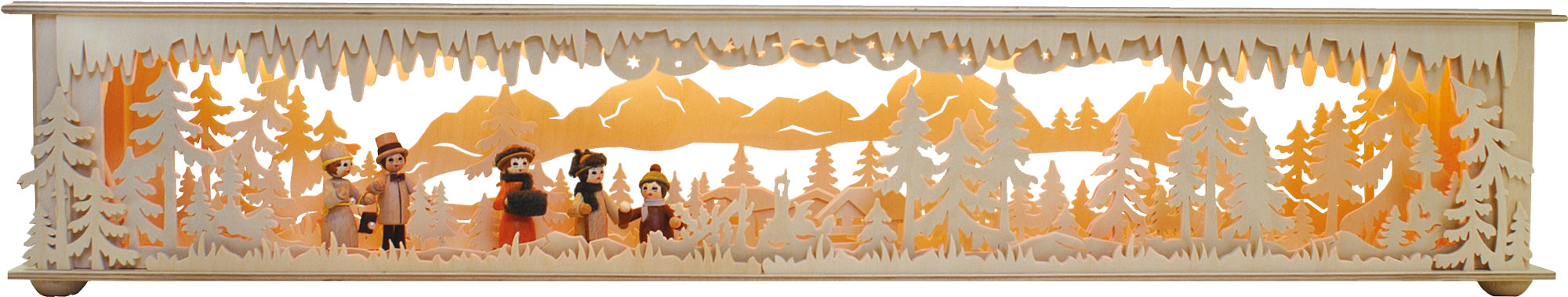 Size: 50 x 13.5 x 10 cm (WxHxD) Lighting: LED, 10 pieces Design: Hoarfrost It is winter. Three colour-glazed RATAGS solid wood figures are walking through a freshly snow-covered winter forest. Snow-capped mountains can be seen in the distance, and a hut stands alone in the forest. The indirect LED lighting creates an atmospheric ambience. This room light is suitable as a base for all small RATAGS candle arches that match the style, e.g. D9990-628-R. Genuine handcrafted by RATAGS – Made in Germany – 100% original Erzgebirge