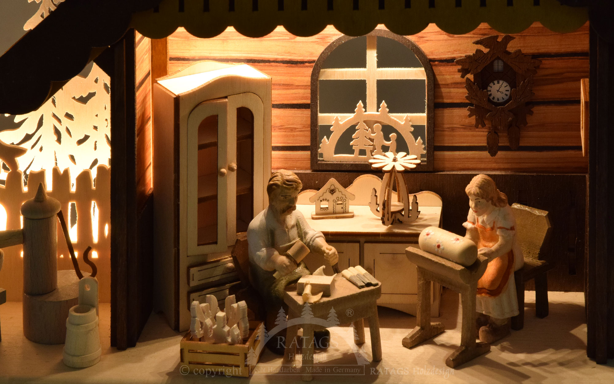 This 3D Schwibbogen depicts a craftsman's workshop with many details. It shows the creation of Erzgebirge wood art using traditional handcrafting techniques. The coloured solid wood figures enhance the scene. The craftsman works on the blanks with a chisel and carpenter's mallet. The finished products are ready for sale on the chest of drawers by the window. The craftsman's wife is making the finest lace on her bobbin pillow. Outside, a woodcutter approaches the house with fresh wood for sale. Against the backdrop of the forest and distant mountains, a swing pump and transport vessels stand in the courtyard of the house. With its indirect, glare-free lighting, this candle arch creates a cosy atmosphere and is a real eye-catcher.