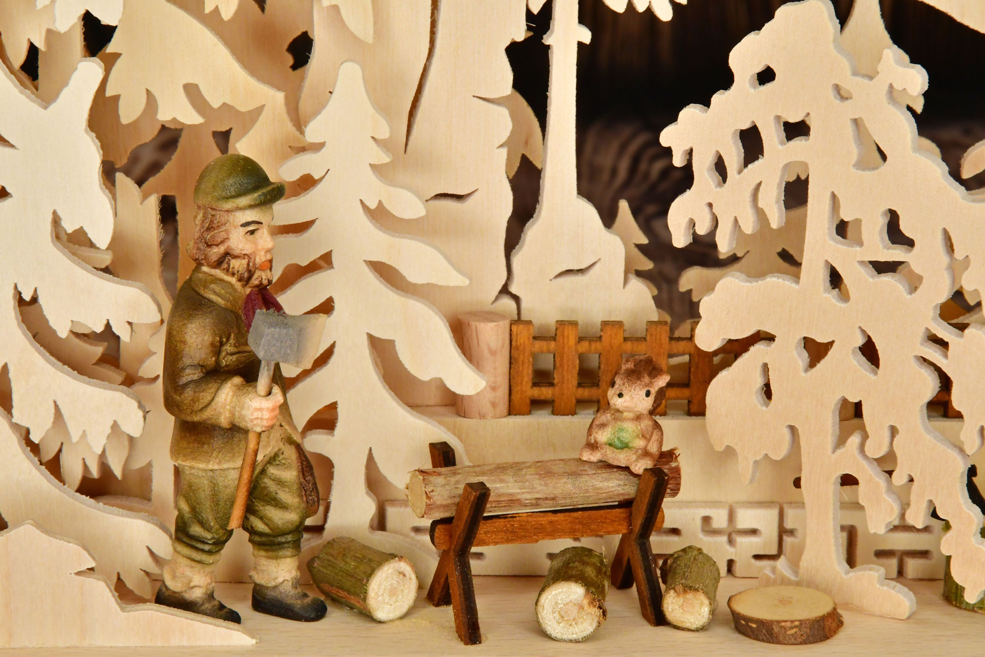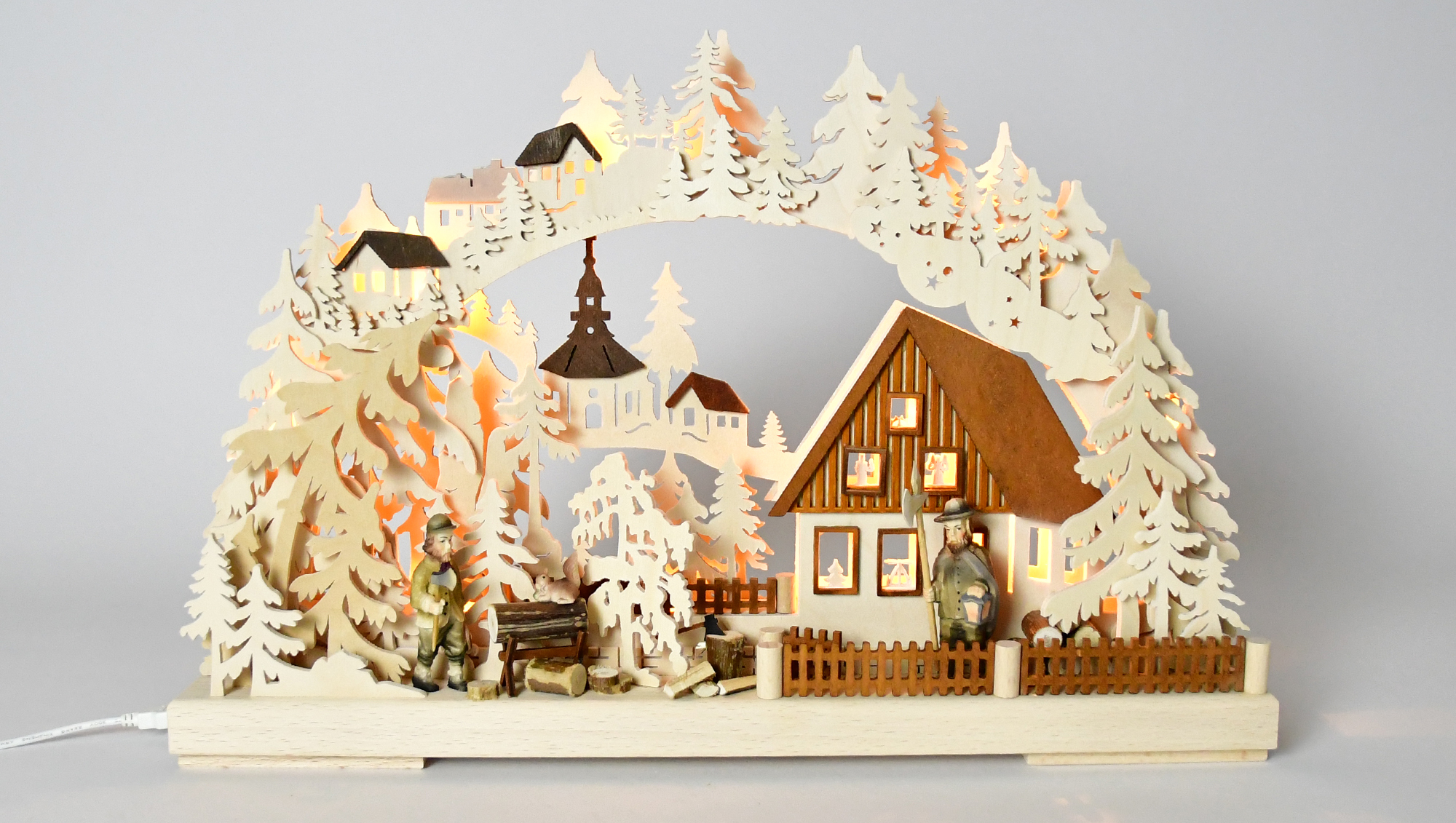 Size: 43 x 30 cm (WxH) Lighting: LED, 10 pieces This double candle arch depicts a family preparing for Christmas. The man brings home a freshly cut fir tree and the woman sweeps the path. The indirect, glare-free lighting creates an atmospheric ambience. Genuine handicraft from RATAGS – Made in Germany – 100% original Erzgebirge