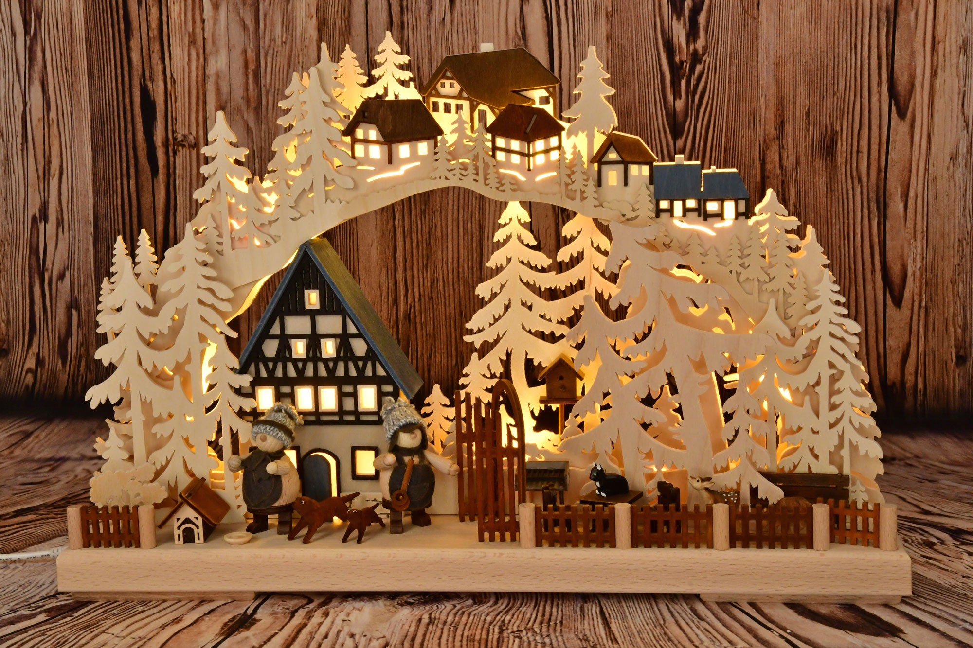 Size approx. 43 x 30 x 10 cm (WxHxD) Lighting: LED, 10 pieces Two hikers are on their way to the forest with their little dog, coming directly from the toy village of Seiffen. The path leads over a small staircase along the pasture fences. Smoke rises from distant rooftops. The striking Seiffen church and some houses are cosily lit. Colour-stained elements and figures give the candle arch a lively appearance. All figures are made of solid wood. The glare-free LED light chain creates an atmospheric ambience. Genuine handicraft from RATAGS – Made in Germany – 100% original Erzgebirge