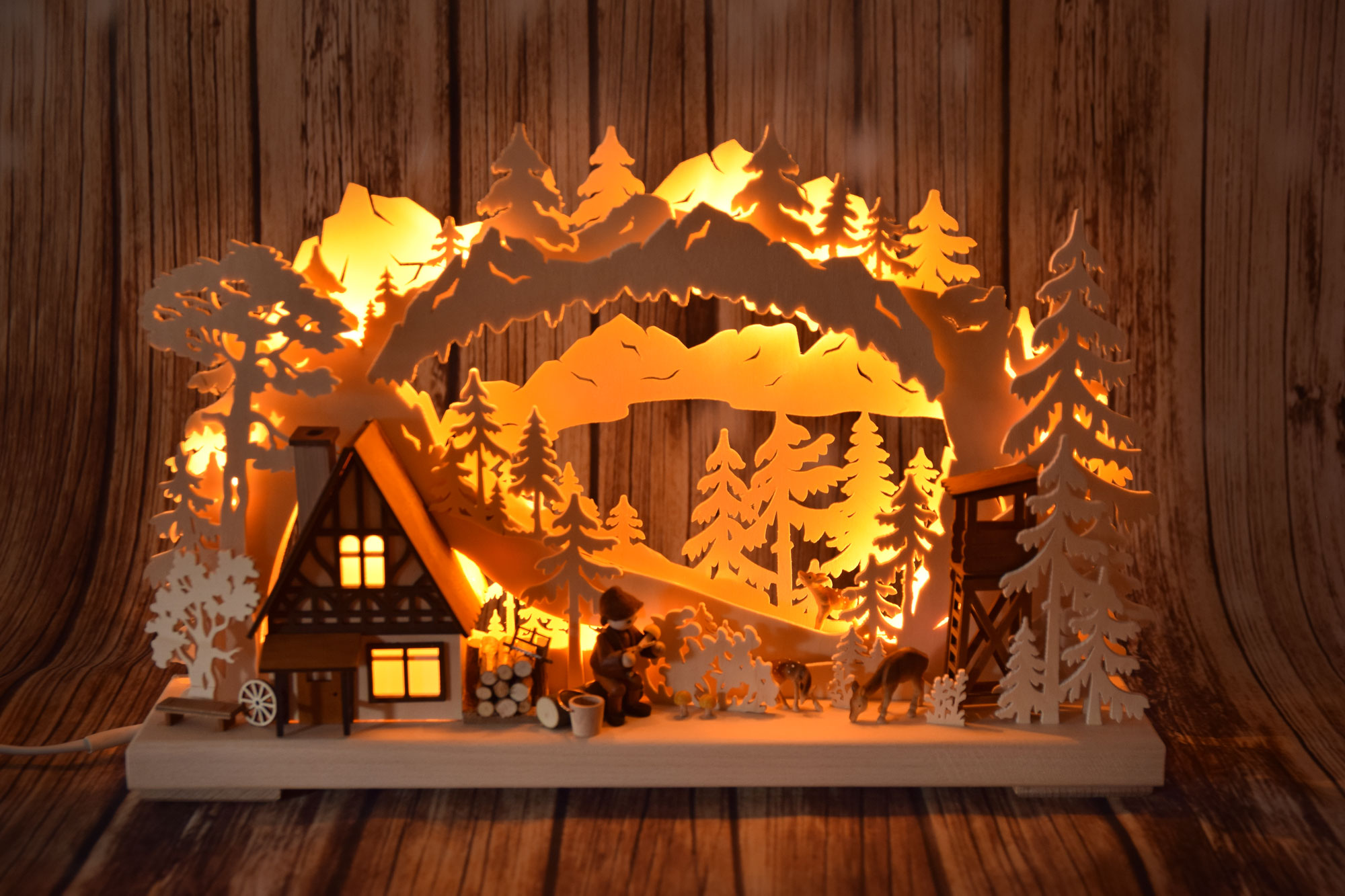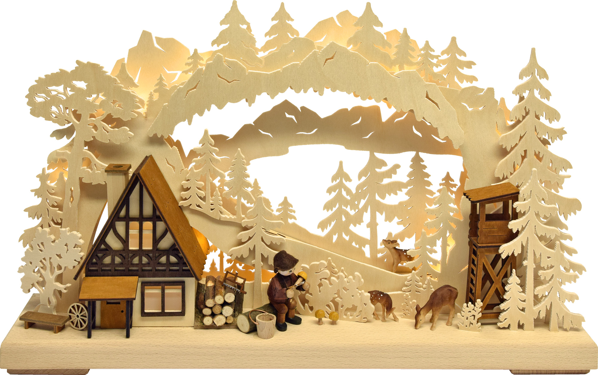 This detailed Schwibbogen depicts a successful mushroom picker cleaning his haul. He is sitting in front of his beautifully lit half-timbered cottage. Two deer graze peacefully in the mixed forest and have nothing to fear from the unoccupied hunting stand. A pile of wood in front of the house promises a cosy home. This peaceful scene is set in a hilly landscape, dominated in the distance by a high mountain range. A beautiful piece of Erzgebirge wood art for the Advent and Christmas season.