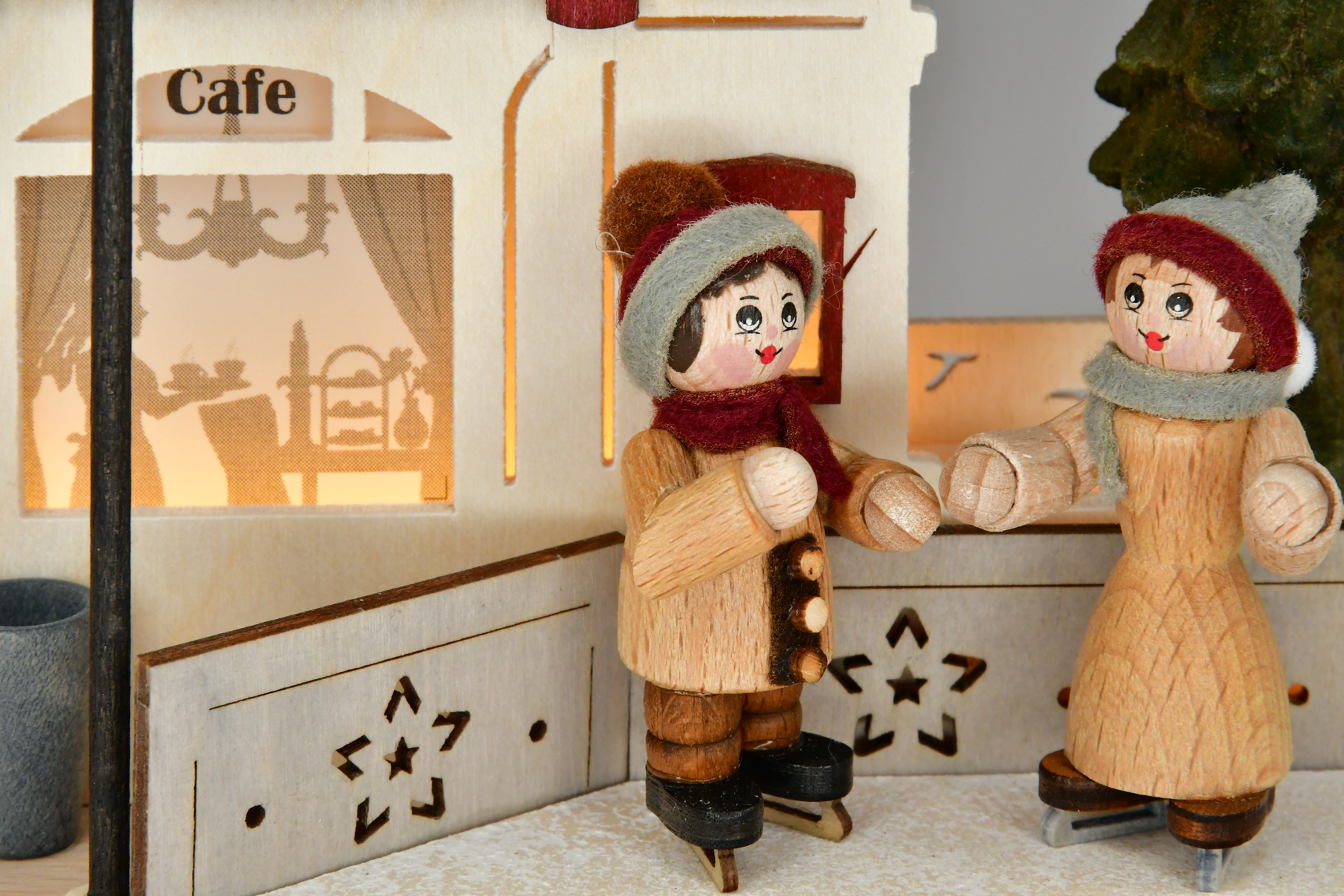 backdrop of historic half-timbered houses in an atmospheric market square during the winter season. A couple is skating under a string of lights. A cosily lit café invites you to warm up, while a little dog barks at a bird on a lamppost. The figures, the little dog and the fir tree are made of solid wood and glazed in colour. Glare-free LED lighting and illuminated windows give this candle arch a festive touch.