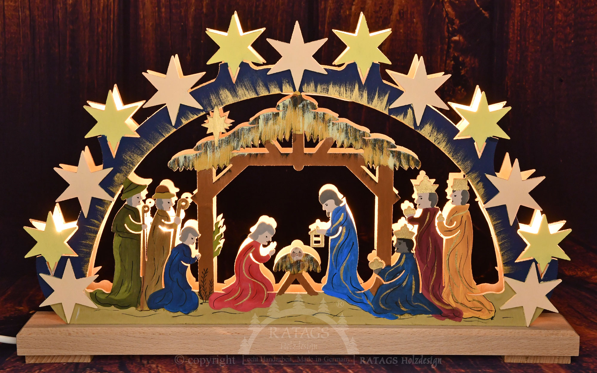 Size: 43 x 27 x 5 cm (WxHxD) Lighting: LED, 10 pieces The birth of Christ is depicted in this double candle arch under an arch of stars. The fretwork made of 3 mm birch plywood is indirectly illuminated by an internal string of lights. Genuine handcrafted by RATAGS – Made in Germany – 100% original Erzgebirge