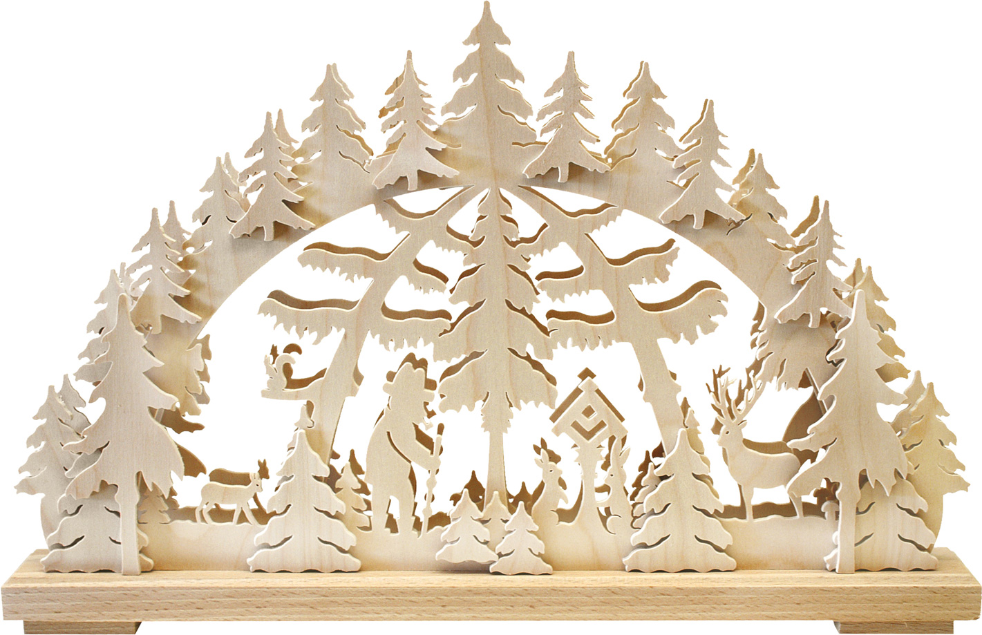 During a leisurely walk in the woods, a hiker with a hat, pipe and walking stick encounters the animals of the forest, such as hares, squirrels, deer and stags with impressive antlers. The double candle arch, indirectly illuminated by LEDs, is a delicate fretwork piece made of 3 mm birch plywood.