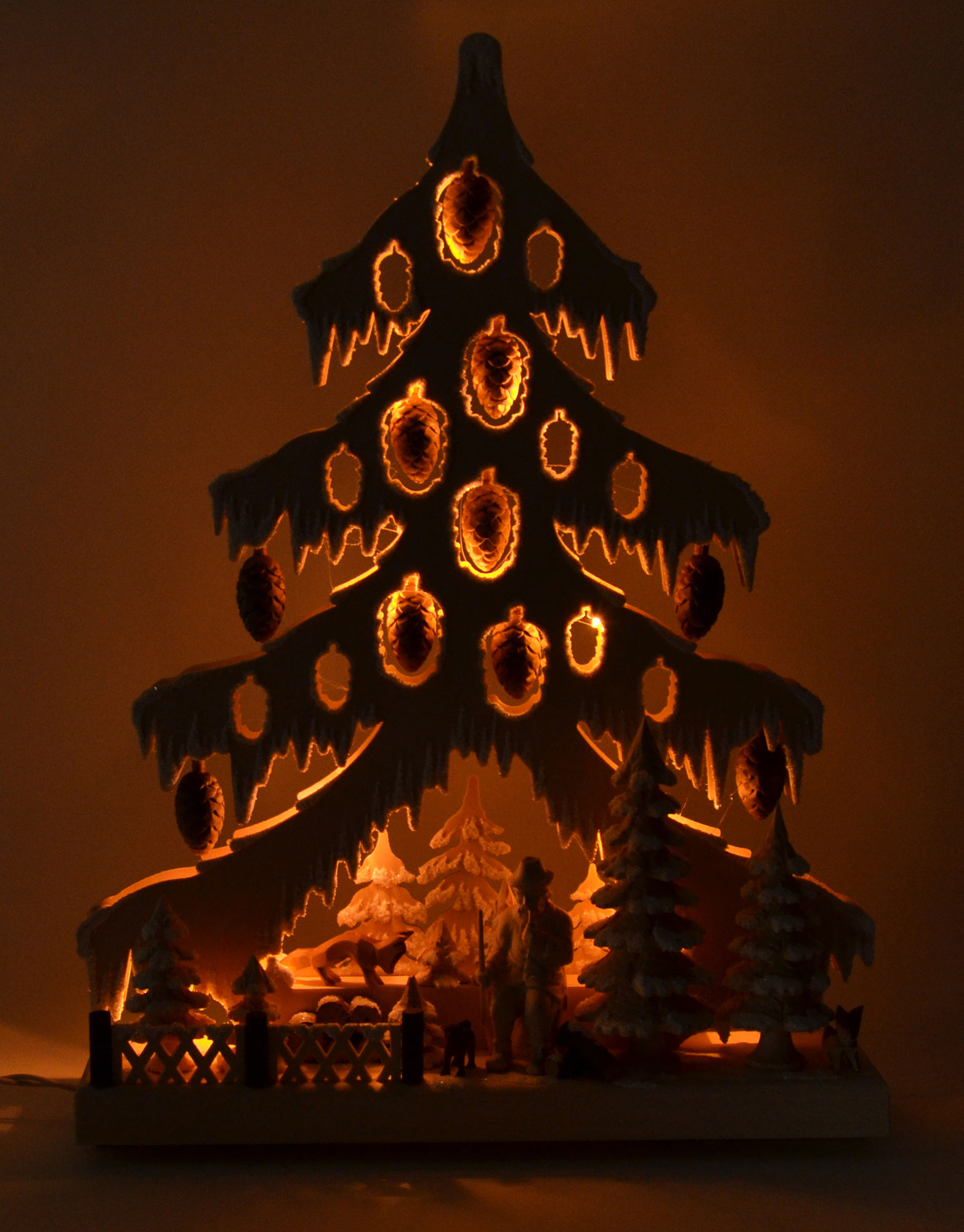 Under a beautiful fir tree with carved, colour-contrasting cones, a woodcutter makes himself comfortable after a hard day's work. Smoking his pipe, he looks at the hand-carved trees around him. Two hand-carved foxes have noticed the woodcutter's carved dog and watch him with interest. The indirect lighting gives the 3D fir tree its very special charm.