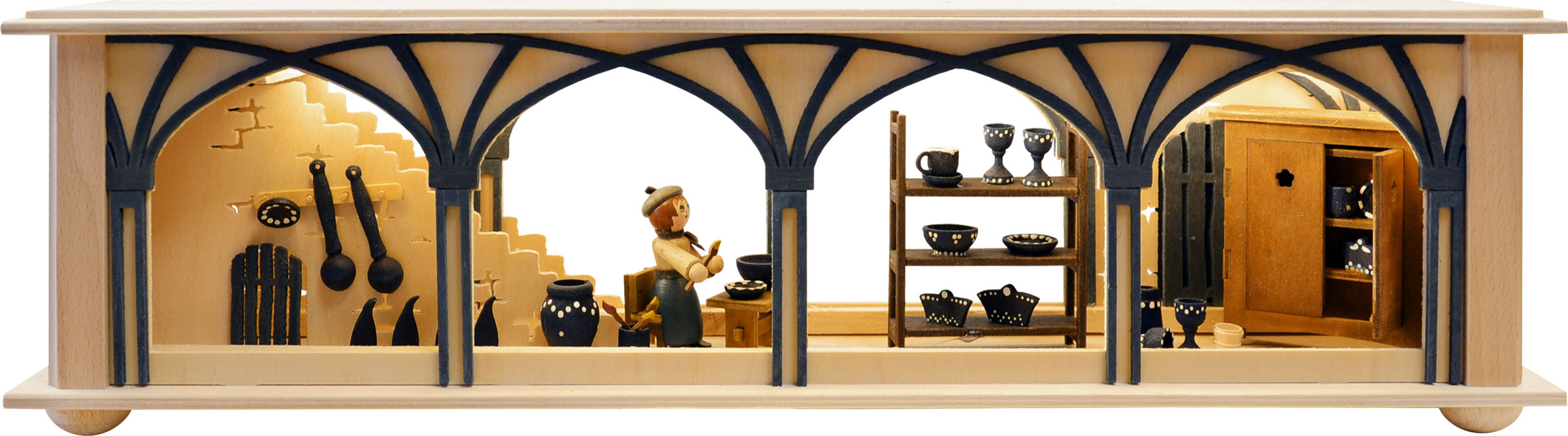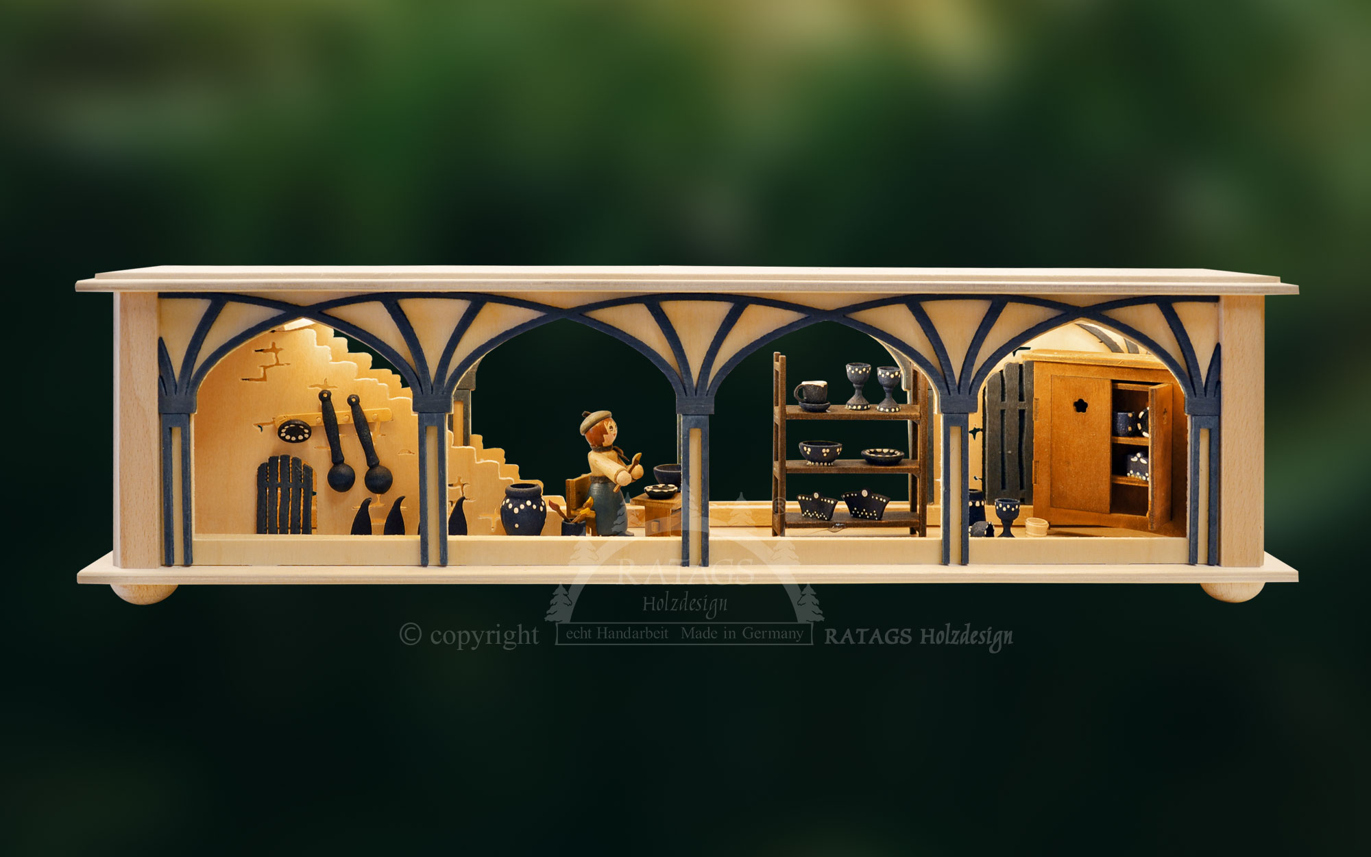 Size: 50 x 12 x 10 cm (WxHxD) Lighting: LED, 10 pieces Full USB Every craftsman, carpenter or artist is happy to have a place to store their utensils such as wood, tools and other building materials. This carpenter's store is located in a brown-coloured vaulted cellar. A circular saw, a wood saw, a shelf with wooden slats and blocks, a toolbox, two workbenches and lots of small tools complete the picture. An all-round successful under-bench for many of the candle arches in our range. Genuine handcrafted by RATAGS – Made in Germany – 100% original Erzgebirge