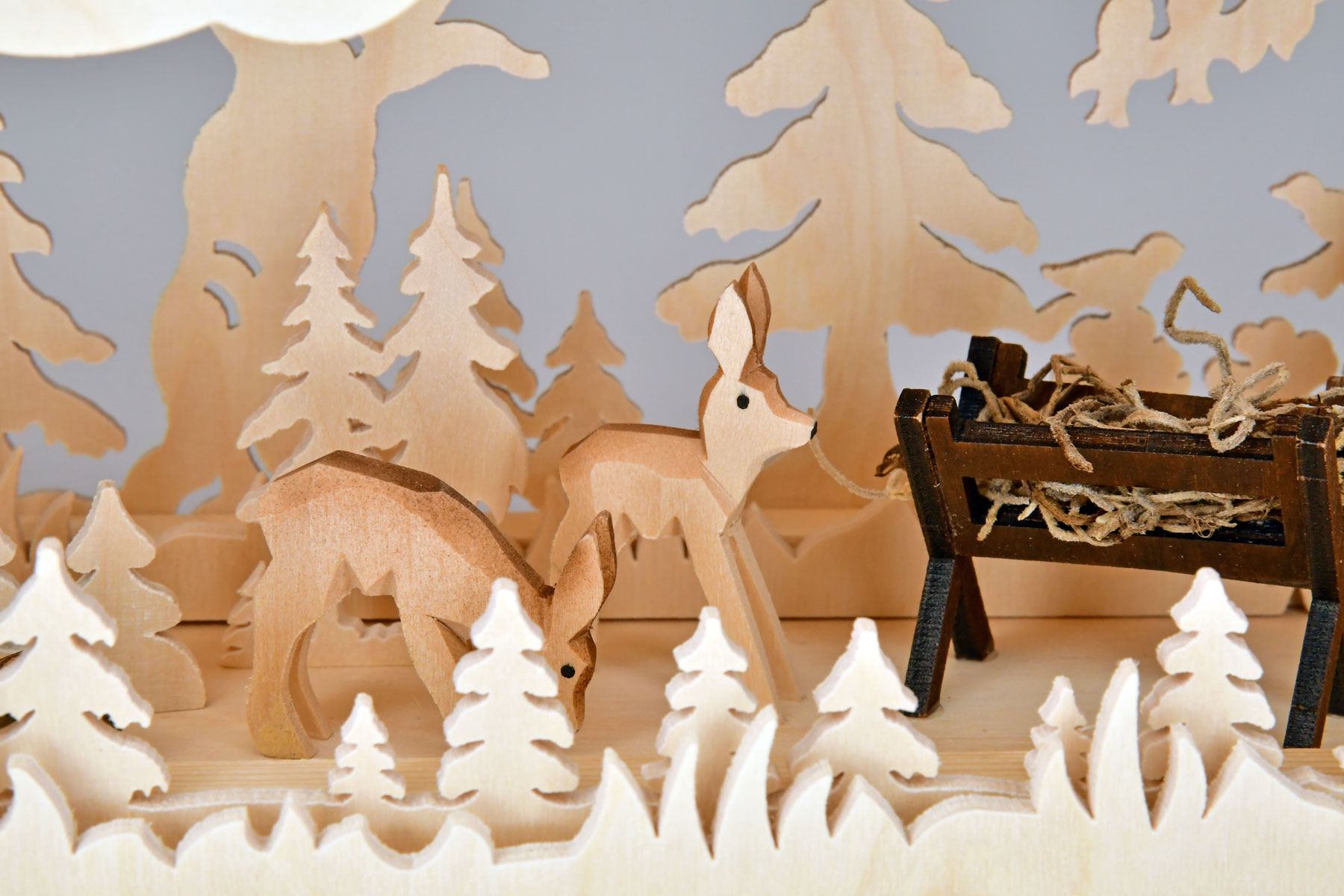 During the winter months, deer find it very difficult to find food. To make it easier for the animals, feeding racks are set up and filled with hay. Deer are shy forest dwellers, so it is all the more wonderful to be able to secretly watch them feeding in the evening from the window. The roofs of the houses are colourfully painted and the deer are hand-carved.