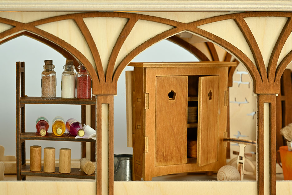This beautiful house cellar with a colour-contrasting vault, in the form of a room light, was created by RATAGS. Many accessories, such as filled shelves, a cupboard, toys, a workbench, brushes and buckets, invite the viewer to linger. A perfect Schwibbogen base. The indirect LED lighting makes the house cellar look even more rustic.