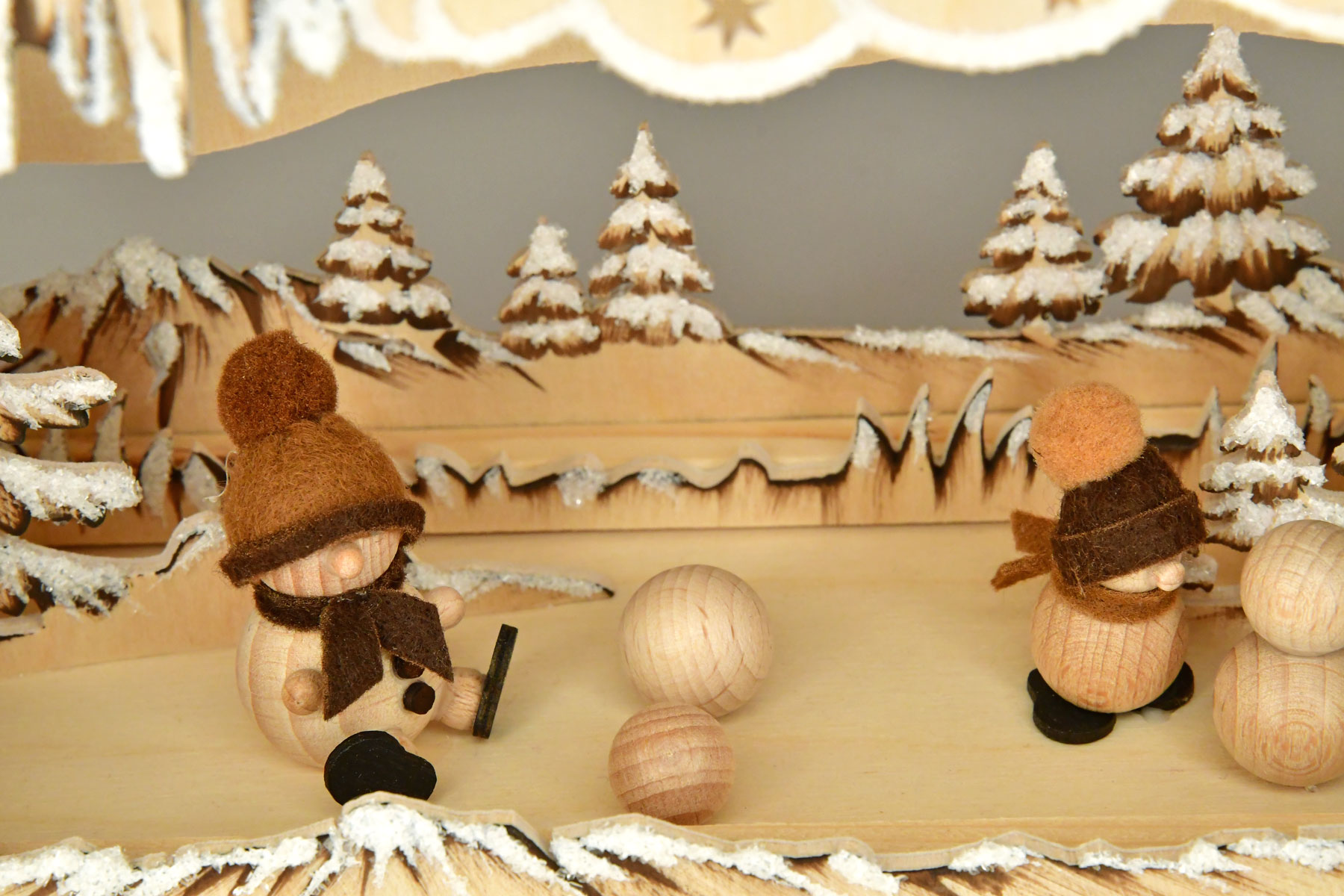 Size: approx. 50 x 12 x 10 cm (WxHxD) Lighting: LED, 10 pieces Three cheerful snowmen are having fun among snow-covered fir trees. Mountains and trees lie in peaceful hibernation, a little bird sings its song. The three of them whisk us away to their wonderful snowman winter world with fun and games. The room light is lovingly designed and masterfully hand-painted. Its indirect lighting and elaborate workmanship make it the ideal complement to our Schwibbogen 9990-608-F-2. Genuine handicraft from RATAGS – Made in Germany – 100% original Erzgebirge