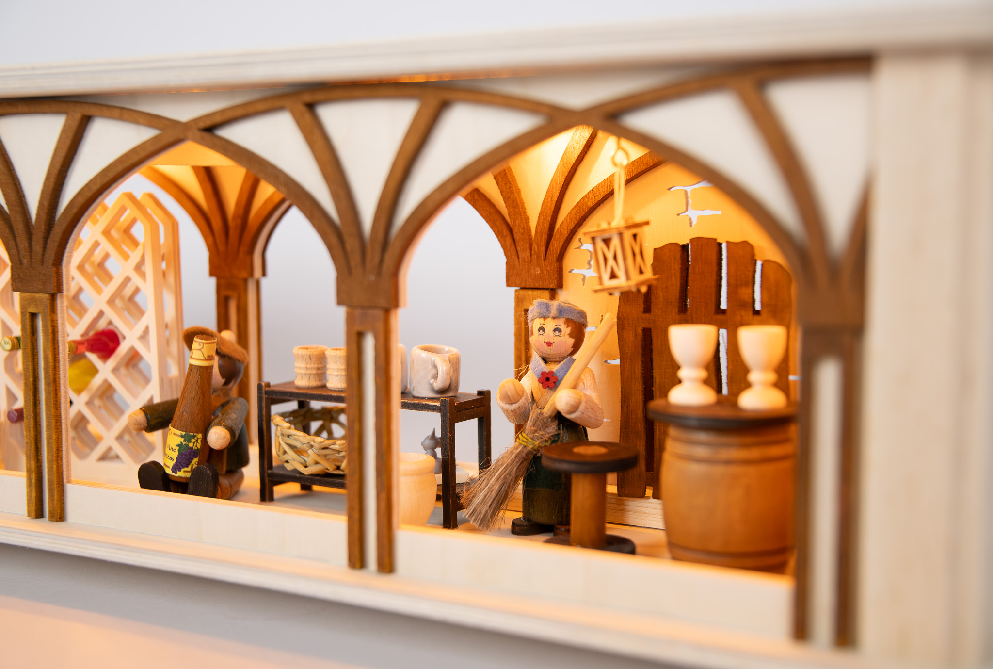 This beautiful wine cellar with a colour-contrasting vault, in the form of a room light, was created by RATAGS. Many accessories such as wine barrels, a wine rack, a seating area for wine tasting, two figures and much more invite the viewer to linger. A perfect Schwibbogen base. The indirect LED lighting makes the wine cellar look even more rustic.