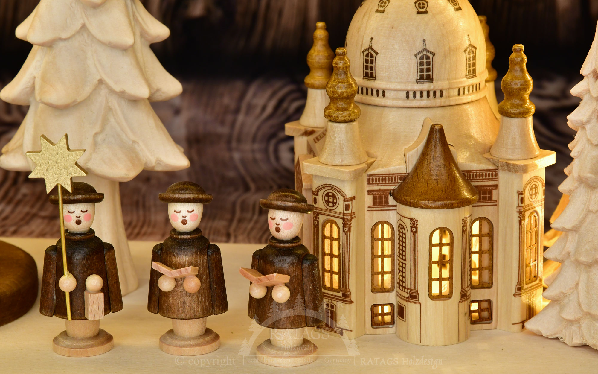 solid wood Schwibbogen from RATAGS with decorative mouldings in brown tones. An eye-catching feature is the illuminated Dresden Frauenkirche, a landmark of the royal seat of Dresden. During the Christmas season, the carol singers wander from house to house, delighting people's hearts with their songs. All the figures, trees, church and houses are made of solid wood and some are glazed in colour. The glare-free LED lighting creates an atmospheric ambience.