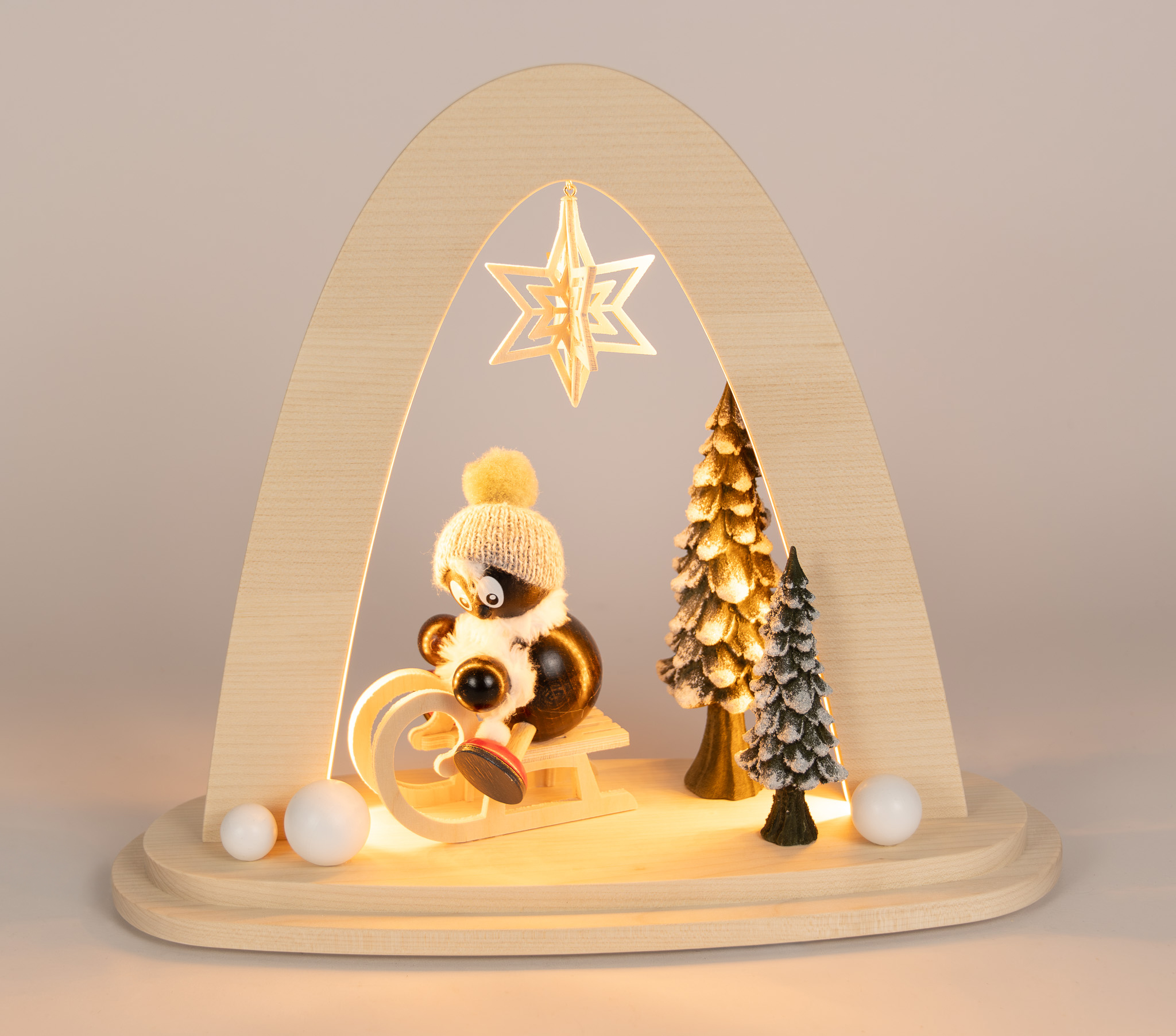 Pitti is sledging under a lucky star, because his success story continues. The eye-catching feature of this modern candle arch is the illuminated scene in the centre of the arch. Pitti, made of solid wood, is sledging past two fir trees, which are also made of solid wood and coloured. A snow shovel and three snow globes illustrate the season. The glare-free LED lighting provides atmospheric light and creates a cosy atmosphere.