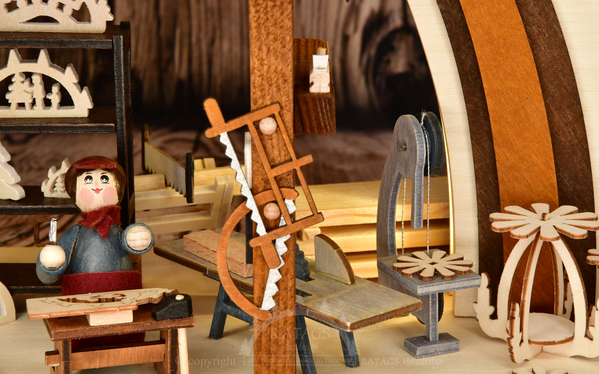 A charming solid wood Schwibbogen from RATAGS. The work in a carpenter's workshop is depicted with extraordinary detail. This workshop specialises in the production of Erzgebirge wood art. A carver sits at a well-stocked workbench, apparently working on figures for pyramids and candle arches. Another employee stands at a woodturning lathe, making classic chip trees, while his colleague next door is doing some fine fretwork. A rip saw for coarser pieces, a band saw, an axe, a plane iron, several hacksaws and various hand tools also belong in a well-equipped carpentry workshop. Raw products, accessories and materials required for further production are stored everywhere. The broom is ready to sweep up the wood waste and shavings at the end of the day. Cosily covered and decorated with representative exhibits, this pretty carpentry workshop is perfectly illuminated by a glare-free LED strip. All figures are made of solid wood. This candle arch is an eye-catcher and will make the hearts of all lovers of Erzgebirge craftsmanship beat faster.