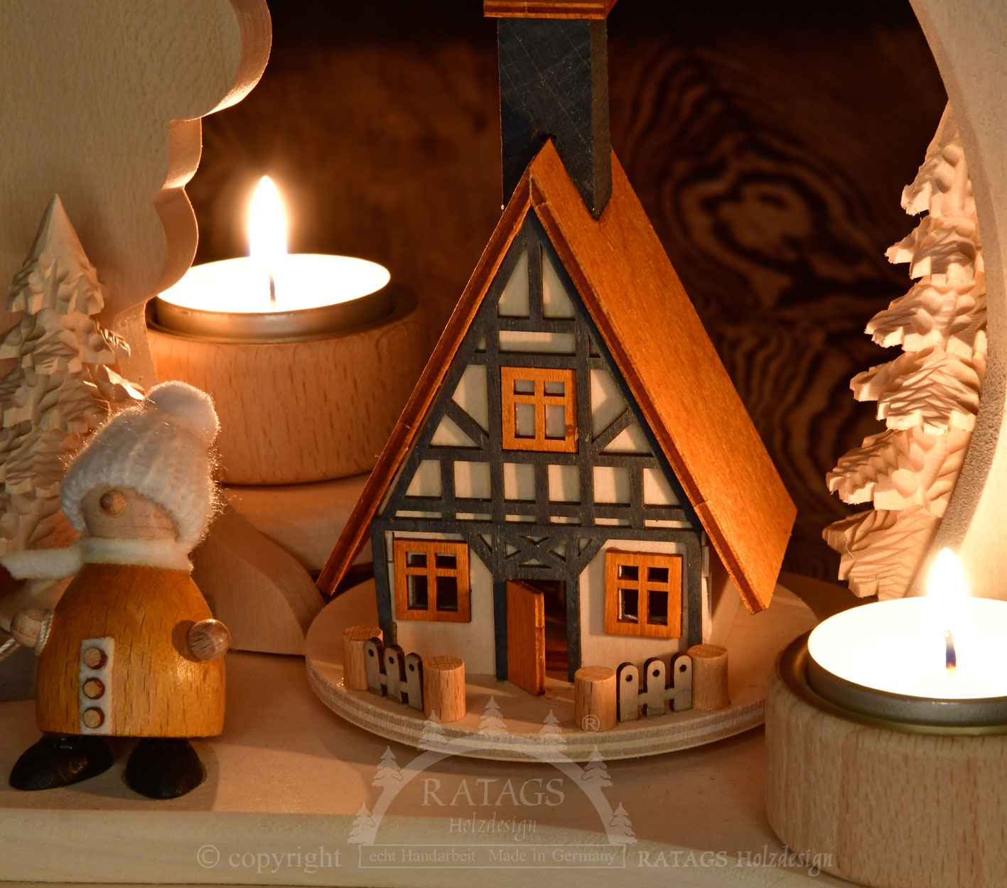 This solid wood pyramid from the "Moonlight" series is particularly delightful to look at. Two cute wikis with knitted bobble hats have just returned from sledging and ice skating. The elegant, colour-coordinated half-timbered house rotates on its own axis thanks to the warmth of the lit tea lights.