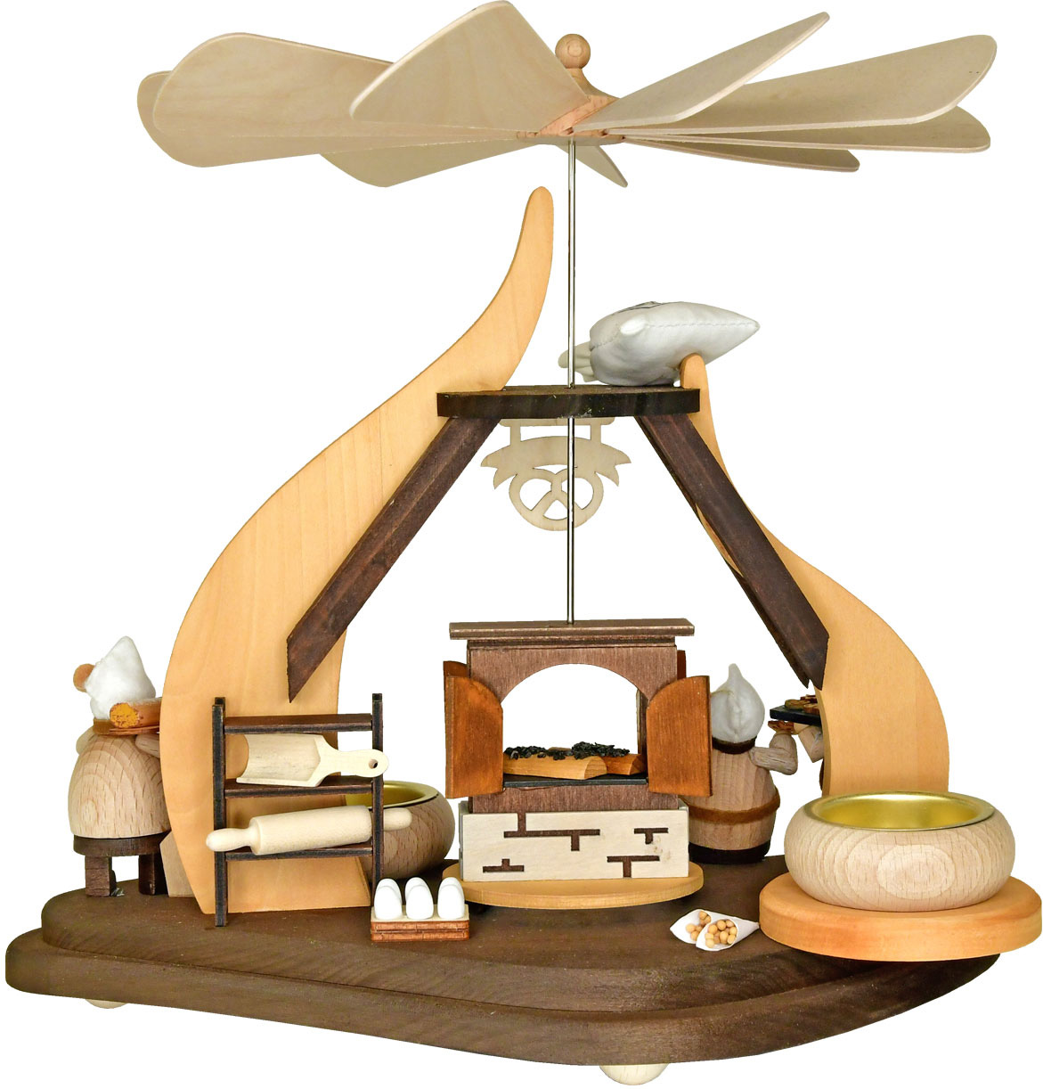 This decorative table pyramid is a charming handmade product from RATAGS. Three cute bakers whirl through the bakery. The central oven rotates on the pyramid plate, which is powered by two tea lights. Small baked goods, ingredients, tools and a printed flour sack add the finishing touches to this wooden artwork from the Erzgebirge.