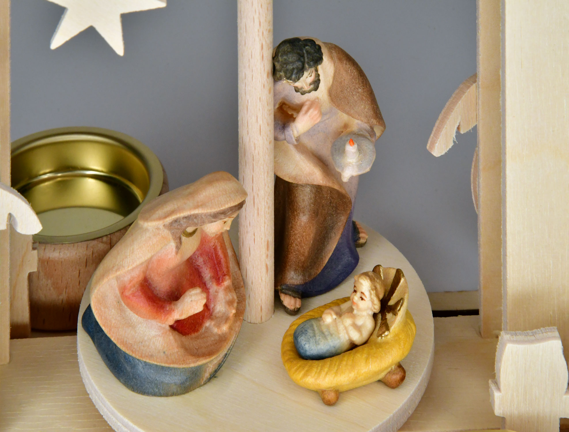 Jesus has come to the stable in Bethlehem. Mary and Joseph rejoice in their son. All figures are hand-carved. This beautiful pyramid is powered by two lit tea lights, which are placed in advance in the solid wood tea light holders provided.