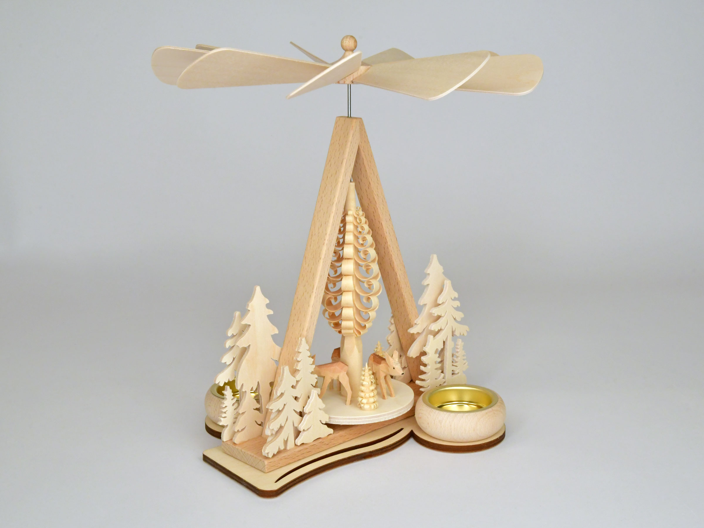 This classic table pyramid is equipped with a rotating plate decorated with fir trees and three hand-carved deer. Sawed tree groups made of light birch plywood line the scene. Two tea light holders hold the tea lights and power the pyramid. Beautiful light and shadow effects on the ceiling are guaranteed.