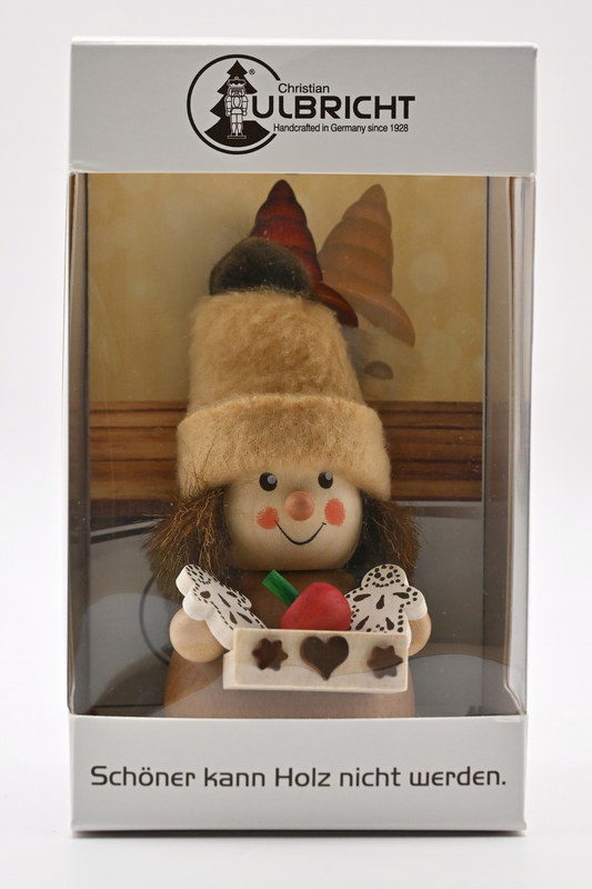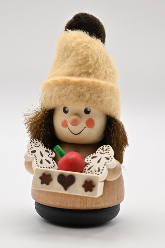 This natural-coloured gingerbread seller certainly won't get cold at the market, as he has pulled his warm bobble hat down low over his face. He has laid out the most delicious gingerbread and baked apples on his large vendor's tray, and their delicious scent fills the air. Perhaps this cute fellow will stop by to see you too?