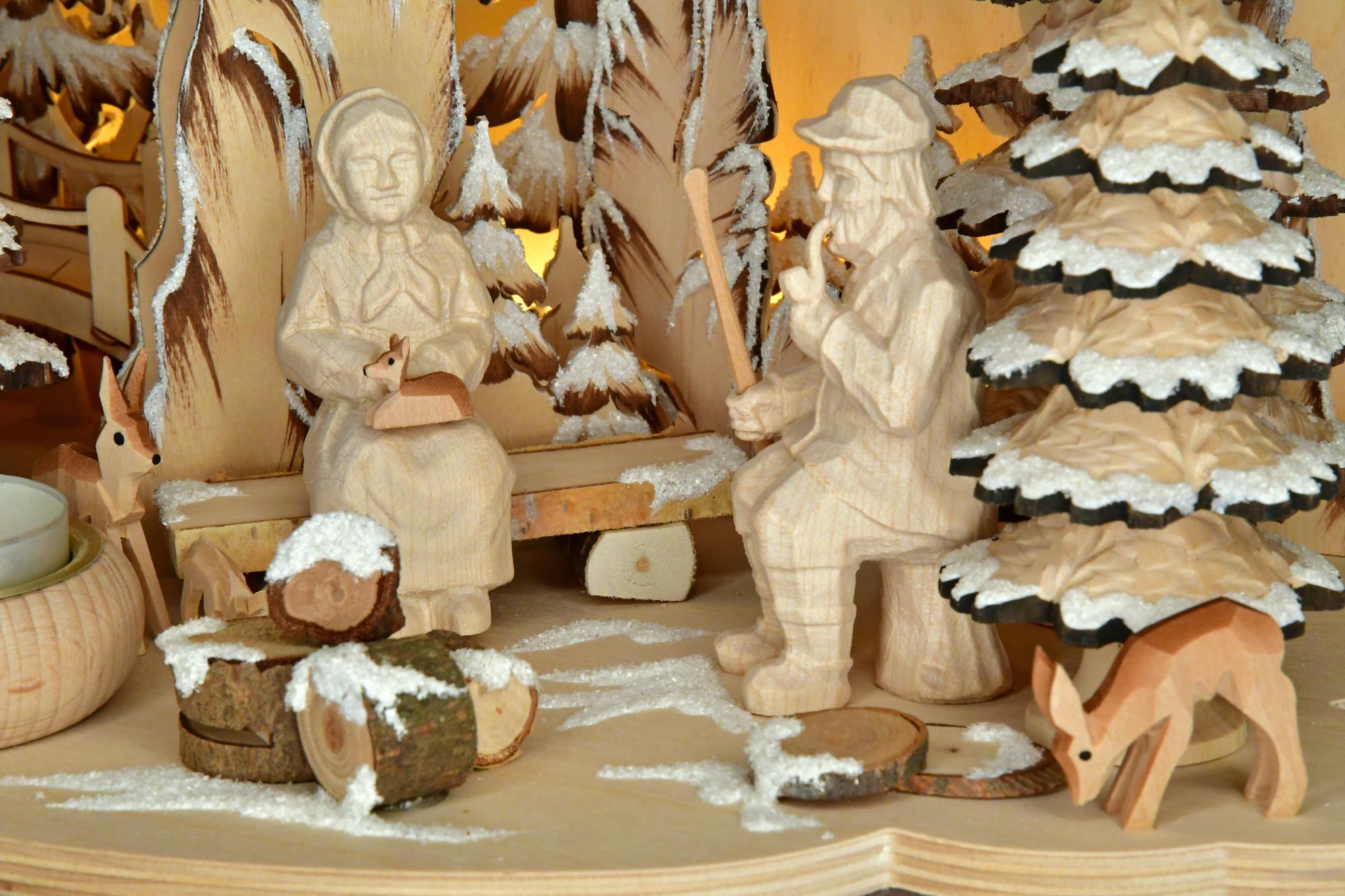 This pretty table pyramid is decorated with a grandmother, grandfather, squirrel, fir tree, pine cones and deer. The pyramid is powered by two lit tea lights, which are placed in the solid wood tea light holders provided. Indirect LED lighting offers an additional function and allows the pyramid to shine atmospherically even without candles. Glittering hoarfrost adds the finishing touch to this RATAGS pyramid. Holes on the back allow the pyramid to be mounted on the wall.