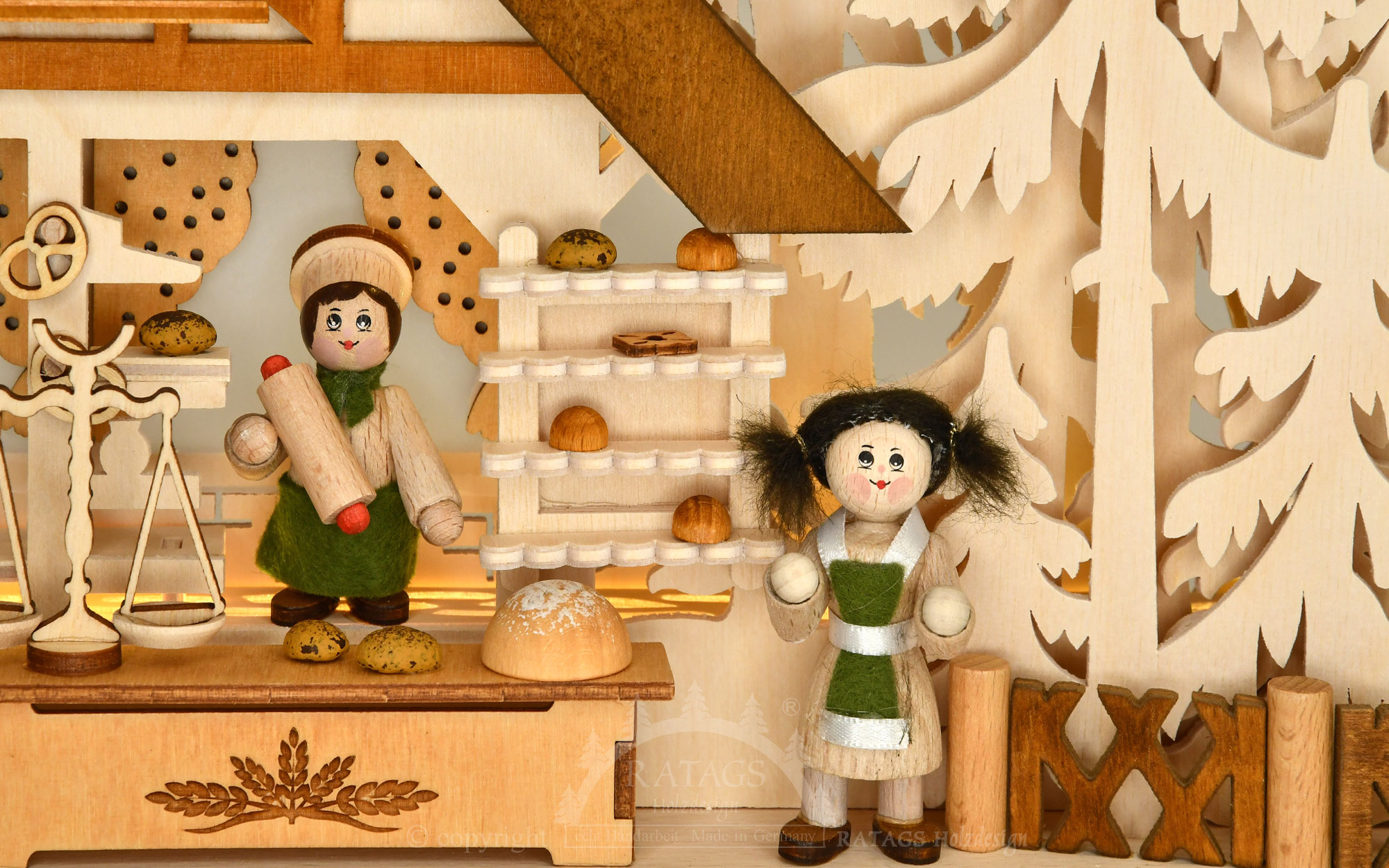 La particularidad de esta panadería radica en su iluminación. Además de la cadena de luces LED de 10 piezas, hemos instalado una tira LED que ilumina la parte inferior del arco. La panadería está rodeada por un delicado bosque de abetos tallados en madera contrachapada de abedul. Tres figuras de madera maciza de Ratags, equipadas con gorros y delantales, trabajan diligentemente en el horno de leña, en la cocina y en el mostrador de venta. Este arco luminoso 3D de los Montes Metálicos contiene muchos detalles diseñados con mucho cariño y pintados a mano, como un rodillo, un colador, una balanza de cocina, un bol para amasar, un saco de harina con carretilla y, por supuesto, muchos deliciosos productos de panadería. La iluminación LED indirecta crea un ambiente acogedor.