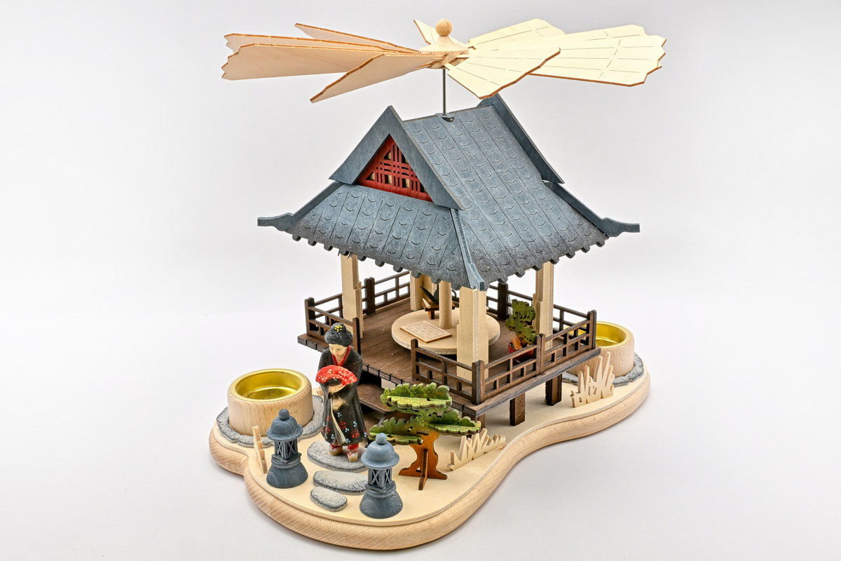 Imeline eksootiline uuendus RATAGSi majast kaug-ida hõnguga: tõusva päikese maa on jäädvustatud lauapüramiidis. Värvitud geisha seisab lehvikuga käes teemaja, chashitsu, ees. Spetsiaalselt selleks otstarbeks ehitatud eraldiseisev teemaja sulandub traditsiooniliselt ümbritsevasse jaapani aeda. Tassid ja kann pöörlevad püramiidplaadil, mida käitab 2 teeküünalt. Klassikaline tiivikratta valguse ja varju mäng loob meeleoluka atmosfääri.