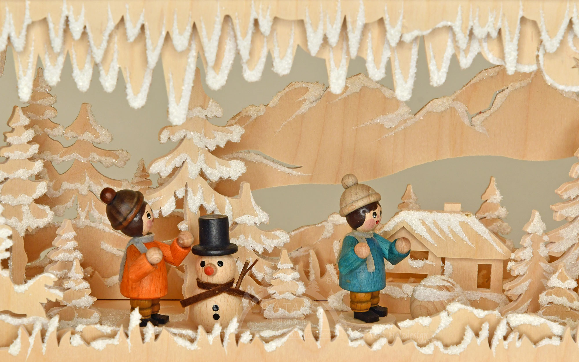 Kaugete mägede muljetavaldava taustaga asub tiheda metsa ümbritsetud küla. Kaks last naudivad talve ja ehitavad lumememme. Pereisa jälgib neid kahega binokliga. Kas nad jõuavad õigeks ajaks laua taha? Kõik figuurid on valmistatud täispuidust ja käsitsi värvitud. Sädelev härmatis annab sellele ruumivalgustile viimase lihvi. Pimestamatu LED-valgustus kastab stseeni meeleolukasse valgusesse.