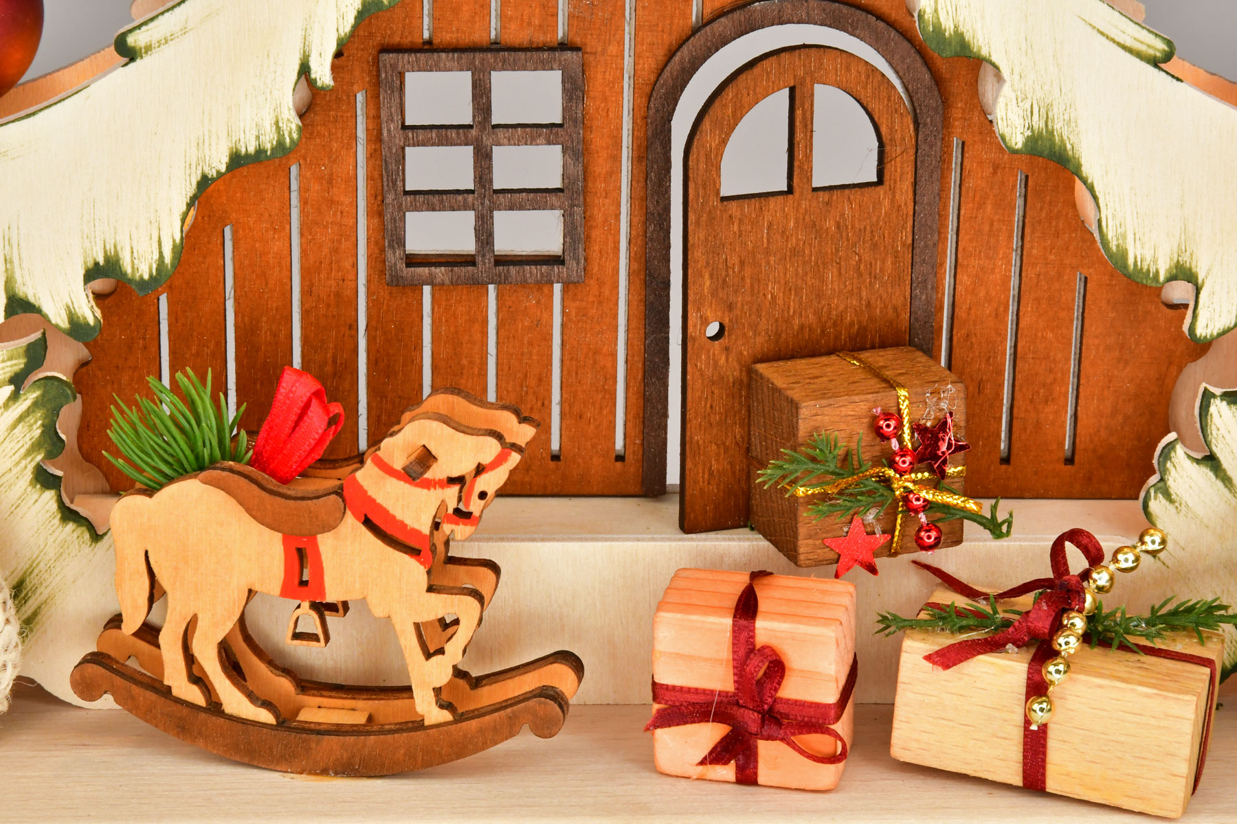 Kuuse kaunistavad 9 punast jõulupalli ja 8 küünalt. Värava ees seisab puidust jõuluvana paljude kingitustega, sealhulgas isegi kiikhobune. Kõik selle kauni loomingu oksad on värvitud kuuse roheliseks. See ainulaadne käsitsi valmistatud Erzgebirgi käsitöö peaks leidma oma kodus erilise koha.