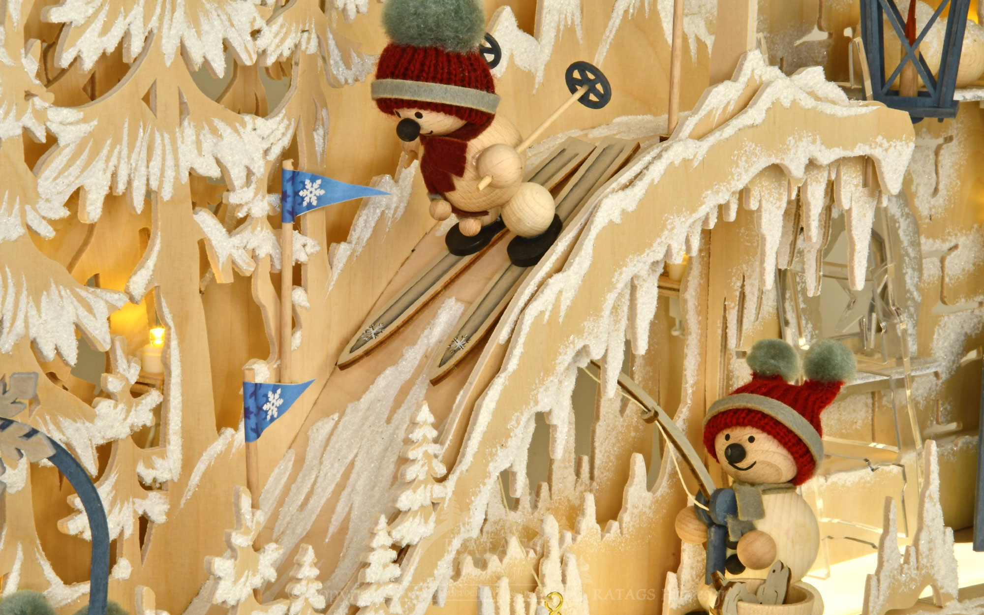 Koko: 32 x 44 cm (LxK) Valaistus: LED, 10-osainen Malli: Raureif Skiparadiesissa on paljon löydettävää. "Lumipallomme" iloitsevat suuressa kuusessa, jossa on käsin veistettyjä käpyjä, lumessa. Tänään ohjelmassa on hiihto- ja kelkkailuretki syvän kuusimetsän läpi. Nopeasti neulotut pipot päähän ja laaksoon. Epäsuora LED-valaistus tuo veistetyt kävyt, lumiukot ja leikkisän huurteen oikeuksiinsa. Aitoa käsityötä RATAGS-talosta – Made in Germany – 100 % alkuperäistä Erzgebirgeä