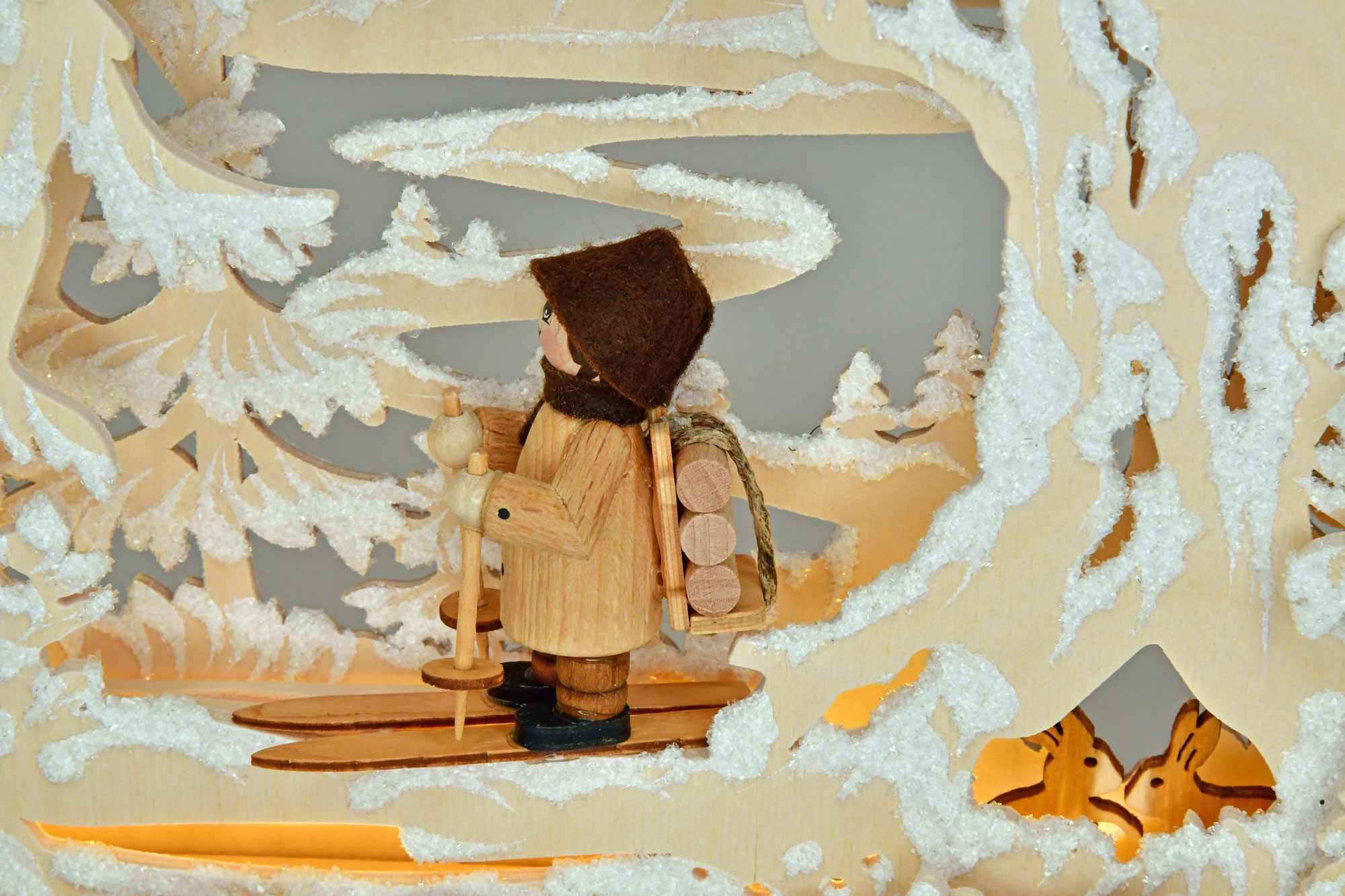 Tiheän metsän keskellä seisoo puunkorjaajan mökki. Savu nousee savupiipusta ja luo kodikasta tunnelmaa. Kirves, hakkuukappale ja polttopuut talon edessä kertovat aloitetusta työstä. Talon isäntä lähestyy jo suksillaan. Hänellä on tuoretta polttopuuta kuormatelineellään. Tämä RATAGS-kynttiläkaari koivuvanerista on epäsuorasti valaistu ja luo tunnelmallisen ilmapiirin. Kimalteleva huurteinen kuorrutus antaa tälle RATAGS-kynttiläkaarelle viimeisen silauksen.