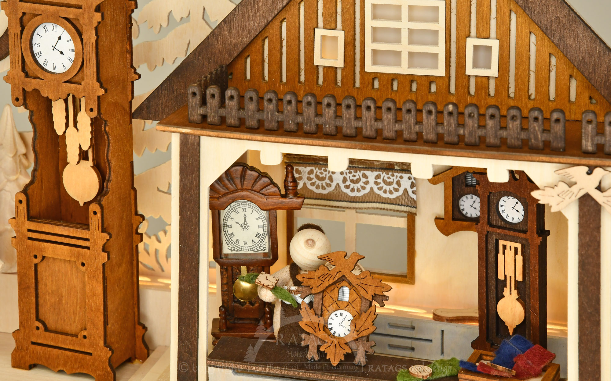 3D-Schwibbogen "Uhrmacherwerkstatt" on valmistettu hienovaraisesti ja suurella rakkaudella yksityiskohtiin. Kaksi sorvattua kelloseppää työskentelee viihtyisässä puutalossa. Toisessa huoneessa on työpaja, jossa on kaikenlaisia työkaluja, toisessa huoneessa on myyntitila tiskin takana. Katolla on myös puutarha, jossa on pöytä ja tuolit. Työpajan edessä on suuri käkikello. Käsin veistetyt kuuset täydentävät kuvaa. Tämän valokaaren kruunaa aito, paristoilla toimiva kello näkyvällä paikalla. Taitavasti asennettu LED-valoketju huolehtii kodikkaasta valaistuksesta.
