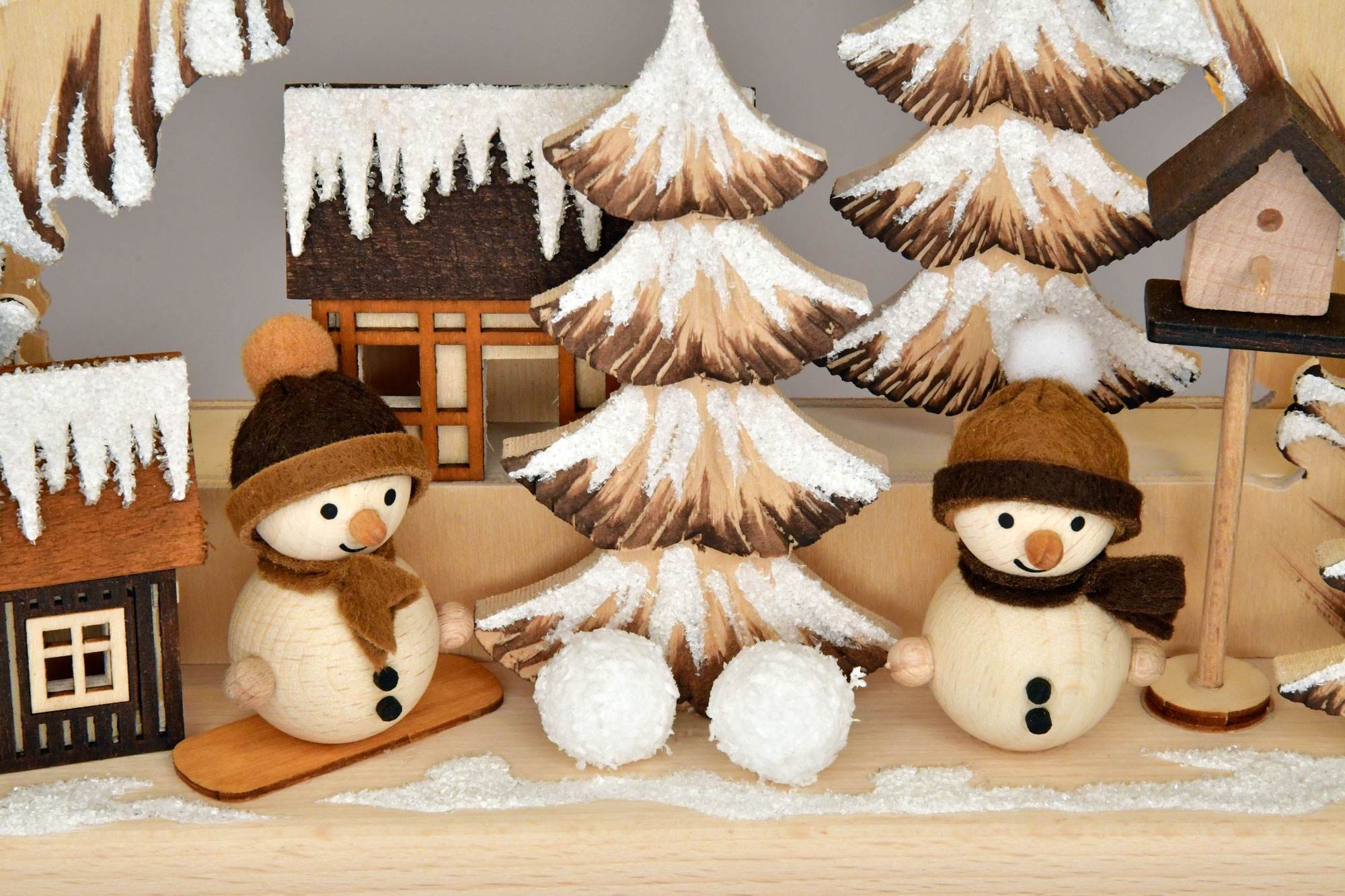 Lumisessa metsässä sijaitsee pieni, kodikas kylä. Söpöt, luonnolliset lumiukot leikkivät käsinveistettyjen puiden keskellä lumessa. Ihmeelliset lumipallot roikkuvat kuusesta. Hieno ruskea käsinmaalaus, huurteinen huurte ja epäsuora LED-valaistus hämmästyttävät katsojaa.