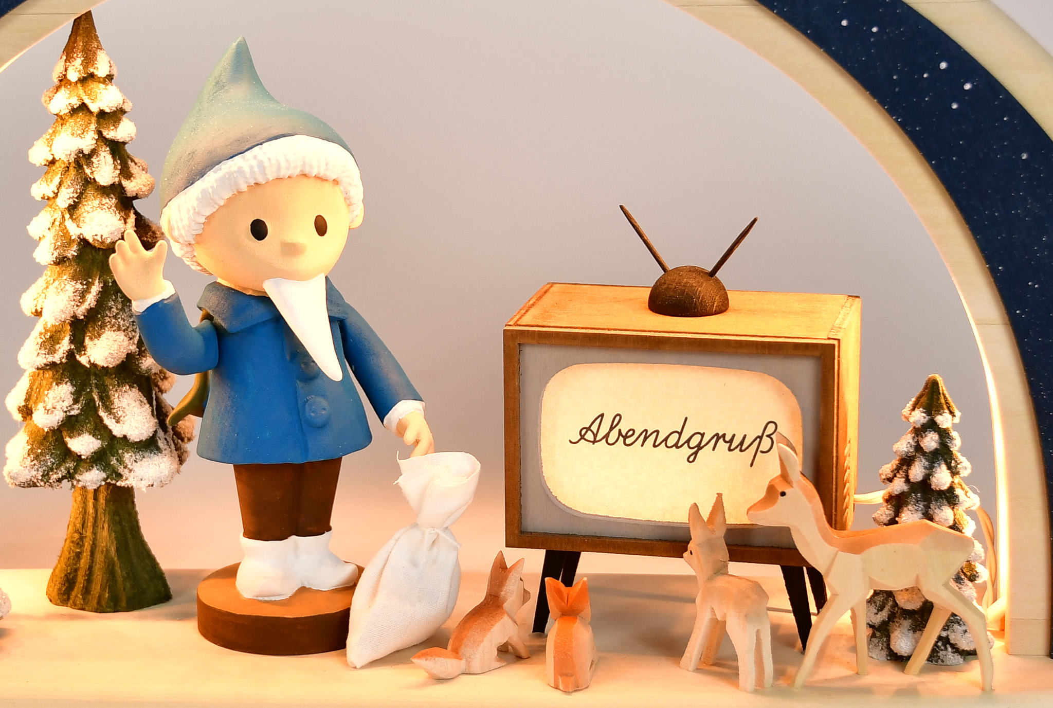 À l'occasion du 65e anniversaire de notre Sandmännchen, on a développé et produit cet arc lumineux en collaboration avec la chaîne de télévision rbb. Toutes les figurines et tous les arbres sont en bois massif de qualité et colorés à la main. La télé allumée montre une photo d'une émission spéciale anniversaire, les animaux de la forêt regardent. L'éclairage LED anti-éblouissant crée une lumière sympa et une ambiance chaleureuse.