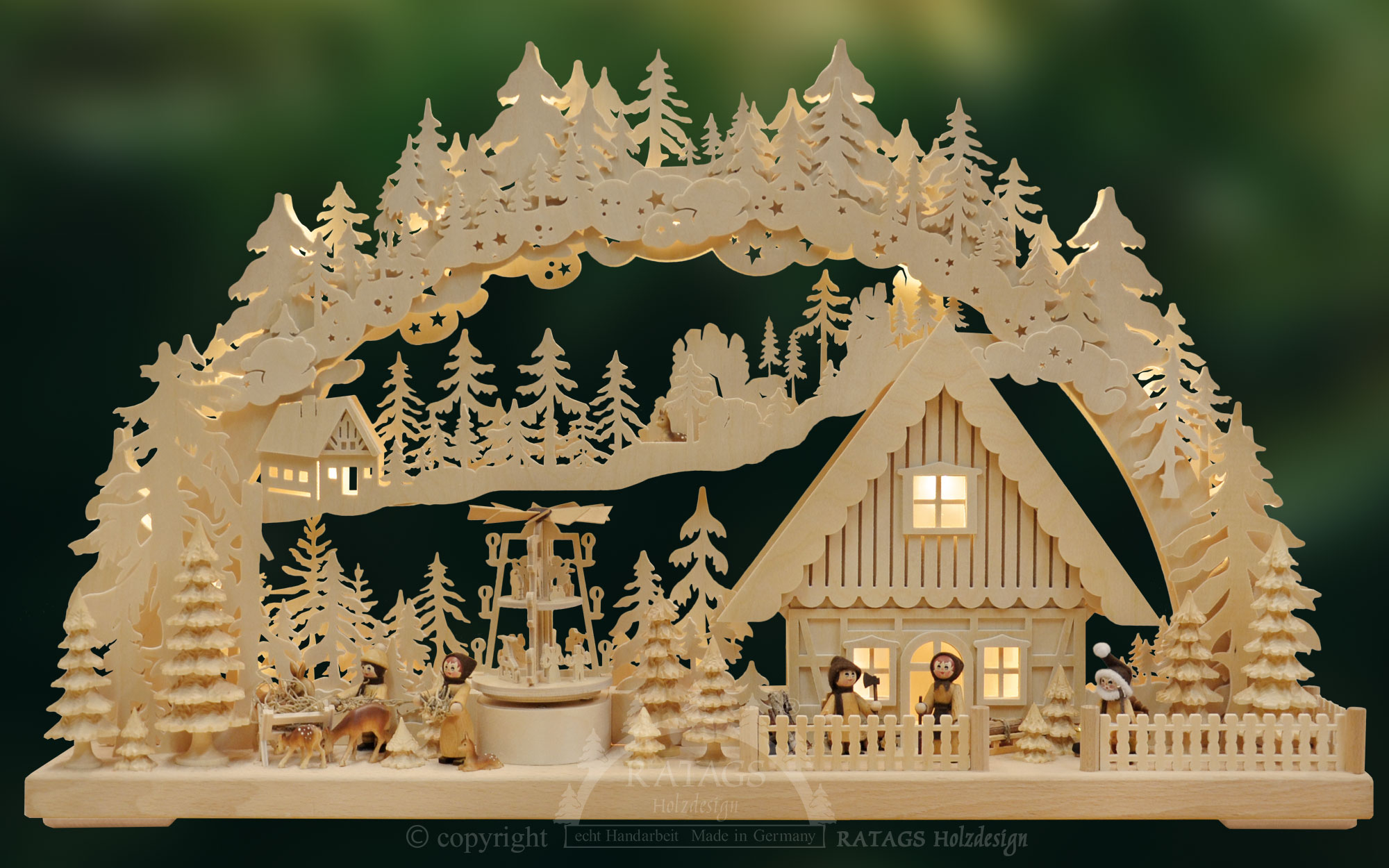 Cet arc lumineux 3D RATAGS, fabriqué avec finesse et souci du détail, est particulièrement élégant dans sa version naturelle. La maison à colombages illuminée attire immédiatement le regard. Les cinq figurines, la famille de chevreuils et plusieurs sapins au premier plan sont en bois massif et principalement colorés. La pyramide électrique est une autre particularité. La scène est éclairée de manière atmosphérique par une guirlande lumineuse LED anti-éblouissante.