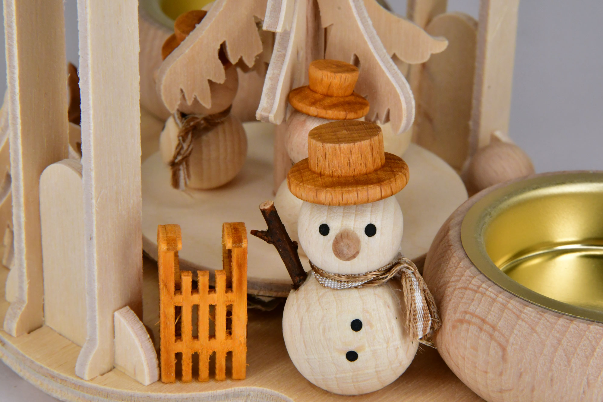 Notre mini-pyramide ne prend pas beaucoup de place et est toujours agréable à regarder. Sous un sapin tournant, les bonhommes de neige profitent du long et froid hiver. La pyramide est alimentée par deux bougies chauffe-plat allumées, qui sont placées dans les bougeoirs en bois massif prévus à cet effet.