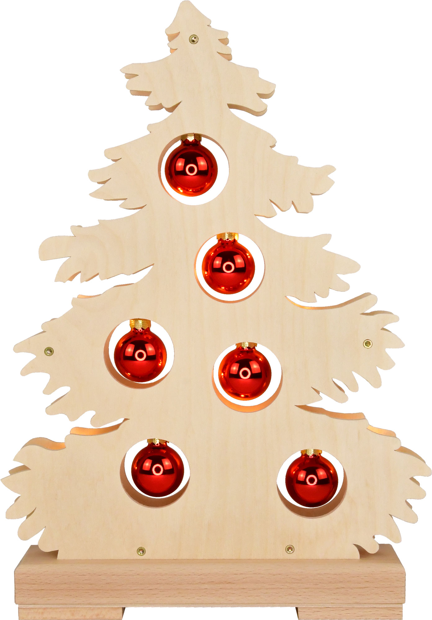 Dekoratív fenyő nyírfa rétegelt lemezből, valódi üveggömbökkel. A vakításmentes LED-világítás hangulatos fényt áraszt. A fenyő természetes állapotban maradt. Az USB-tápellátás powerbank segítségével biztosítható, így a fa hálózattól függetlenül is felállítható.