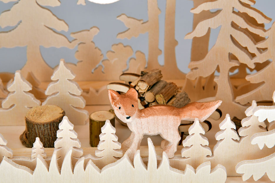 Dopo una giornata di duro lavoro nella foresta, i boscaioli incontrano una piccola volpe. Il randagio sembra essere alla ricerca di cibo. L'illuminazione LED indiretta di questa lampada da interno rende questa scena ancora più bella. Tutte le figure sono scolpite in legno massiccio.
