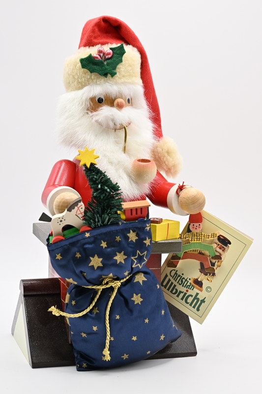 Räuchermann Weihnachtmann auf Kamin, Geschenkesack mit Spielzeugpferd, Christbaum und Lokomotive