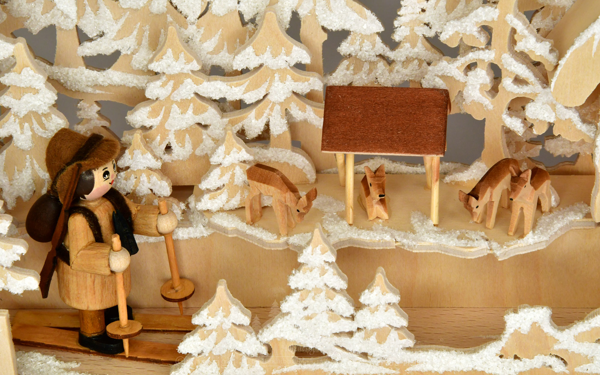雪に覆われた森の中に、シャッター付きの素朴な森の家の小屋が立っています。スキーヤーが、4 頭の鹿が訪れる餌箱を通り過ぎて、自分の住居に向かって進んでいます。 すべてのフィギュアは、無垢材で作られています。間接的な LED 照明が、雰囲気のある空間を作り出しています。シュヴィッボーゲンは、霜が降りたような装飾が、愛情を込めて手作業で施されています。