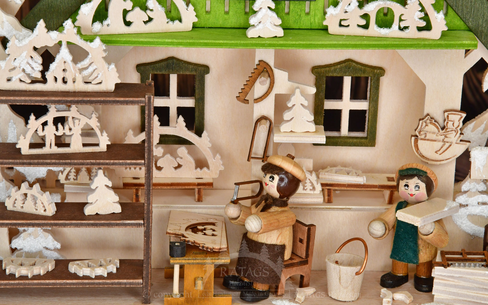 エルツ山地における伝統的な手工芸には、シュヴィッボーゲンの製造も含まれます。この手工芸工房では、さまざまなモチーフやサイズのシュヴィッボーゲンをご覧いただけます。作業員は、糸のこぎりで基板を鋸で切ります。 この3Dライトアーチは、バーチ材合板でできていて、2体のフィギュア、作業台、シュヴィッバーゲンが印象的なデザインになっています。当社の3Dシュヴィッバーゲンは、霜が降りたような霜で、愛情を込めて手作業で装飾されています。