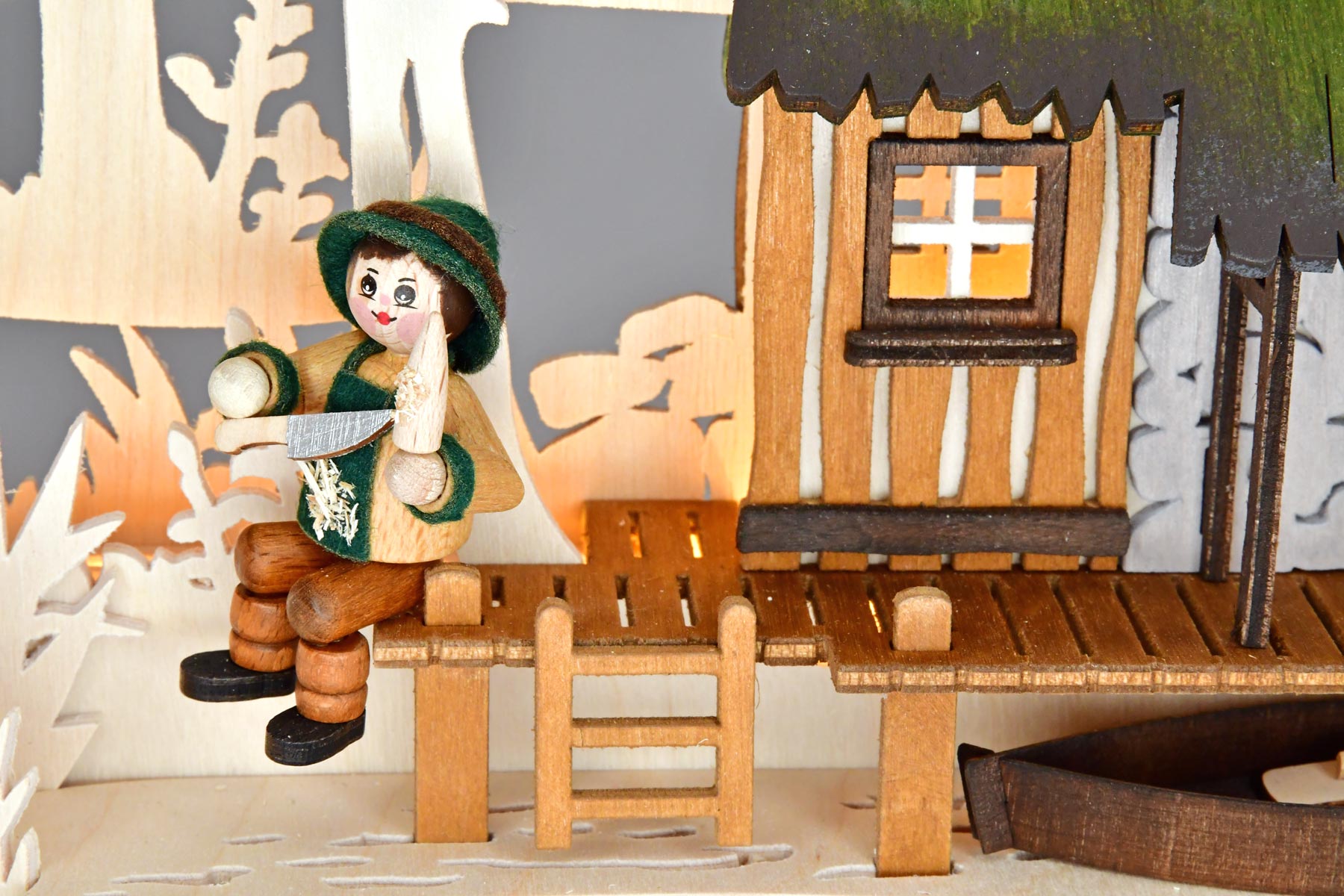牧歌的な森の風景の中に、湖のほとりに一軒の家があります。その住人は桟橋に座って、小さな木を彫っています。桟橋の下では、舟がその使命を待っています。 バケツが用意されています。2頭の鹿が森の端で平和に草を食んでいます。色付きのフィギュアと住居のセグメントが、色彩のアクセントとなっています。この RATAGS のシュヴィーバーゲンは間接照明で、雰囲気のある空間を作り出しています。