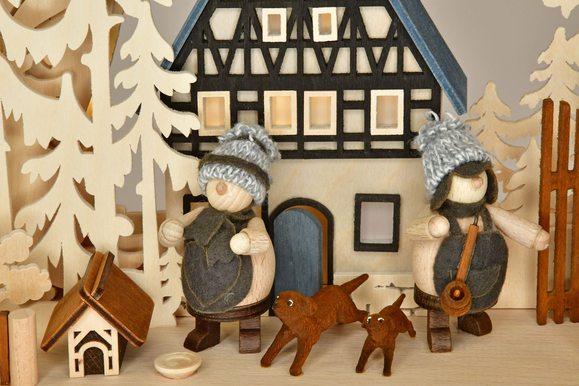 Denne 3D-lysbuen er laget med stor kjærlighet til detaljer. Et fargerikt bindingsverkshus og pittoreske, mindre hus på den ytre buen danner en vakker fargekontrast til de naturlige trærne av bjørkfinér. Det mangler heller ikke et fuglehus og en hundehus i denne lysbuen. To morsomme Molli-figurer passer på to hunder, en svart katt med hvite poter og to hjorter. Alle figurene er laget av massivt tre og malt i farger. Takket være den blendingsfrie LED-lyskjeden er alle vinduene lyst opplyst og dypper hele lysbuen i et stemningsfullt lys.