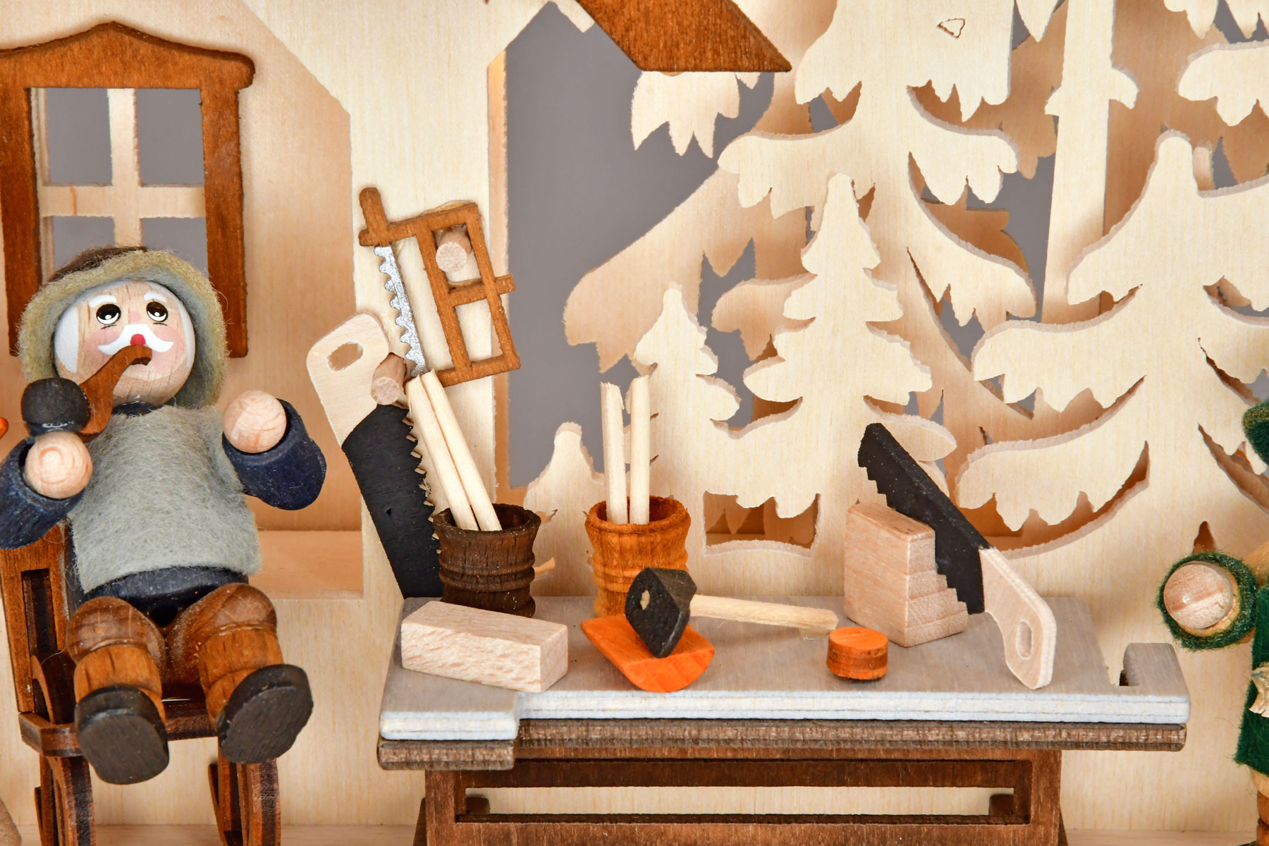 Treleketøyprodusentene hører også til rekken av håndverksverksteder i Erzgebirge. Denne opplyste lysbuen leveres med mange håndlagde og håndmalte detaljer, som gruvearbeider og engel, bestefar i gyngestol, en lærling, et lite trejernbane, mange typiske verktøy og andre elementer. En vellykket kreasjon som får hjertene til å slå fortere og blir et blikkfang.