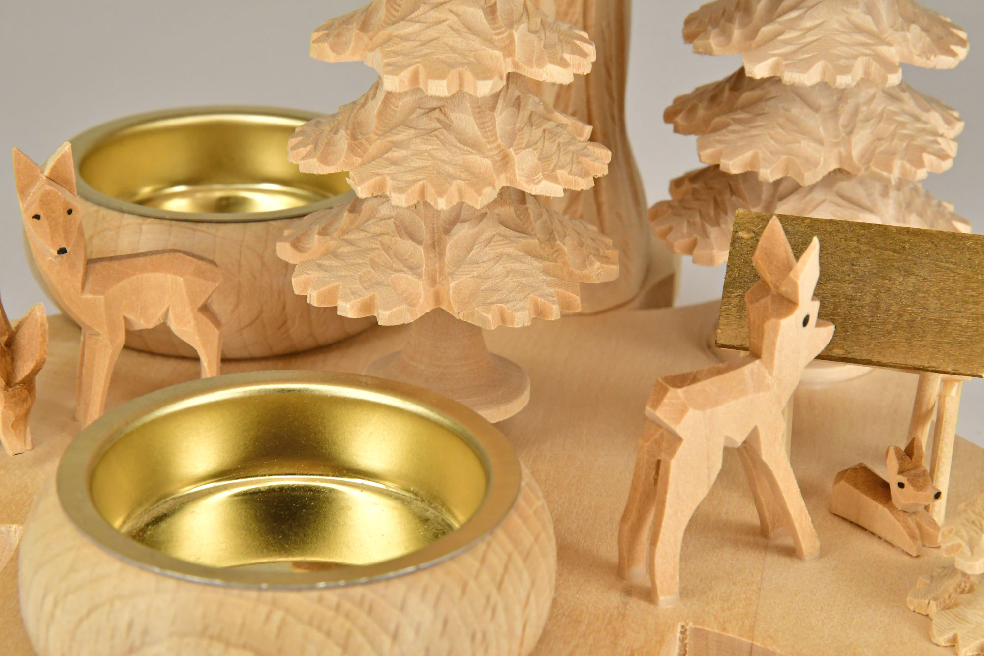 Tre utskårne hjorter boltrer seg mellom fire utskårne trær. Den store roterende granen utgjør midtpunktet i den massive trepyramiden. Den utskårne trestubben er et spesielt blikkfang. Pyramiden drives av to tente telys som plasseres i de medfølgende telysholderne i massivt tre.
