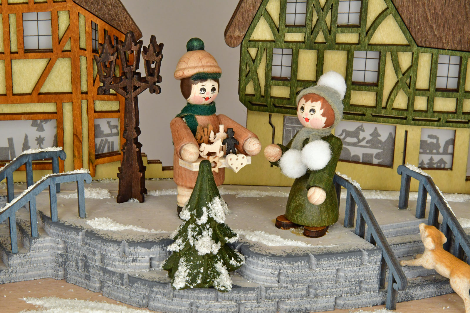 Sentrum av denne vakre granen av bjørkfiner dannes av en torg som avgrenses av to fargerike bindingsverkshus med butikker. En gutt tilbyr en dame varer fra Erzgebirge fra sin bukkebrett. En gatemusikant sørger for julestemning, som passer godt til den røde stjernen som danner et fargerikt blikkfang midt på torget. En livlig liten hund hopper opp trappen. Granen er pyntet med hvite snøkuler og dekorert for hånd med frostig rim. Stjernen på toppen er avtakbar. Den indirekte LED-belysningen skaper en stemningsfull atmosfære i rommet.